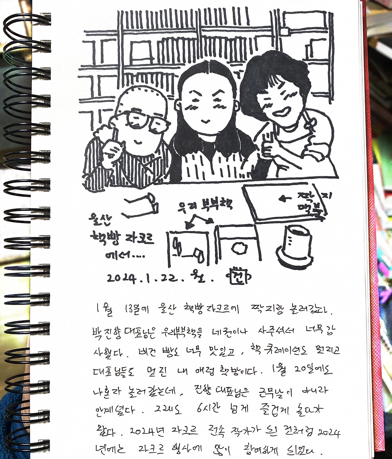 1월 13일에 울산 책빵자크르에 짝지랑 놀러갔다. 박진향 대표님은 우리 부부 책을 네권이나 사 주셔서(종류별로 한권씩) 너무 감사했다. 비건 빵도 너머 맛있고, 책 큐레이션도 멋지고 대표님들도 멋진 내 애정 책방이다. 1월 20에도 나혼자 놀러 갔는데, 진향 대표님은 근무 날이 아니라 안 계셨다. 그래도 6시간 넘게 즐겁게 놀다가 왔다. 2024년은 자크르 전속 작가가 된 것처럼 2024년에는 자크르 행사에 많이 참여하게 되었다.