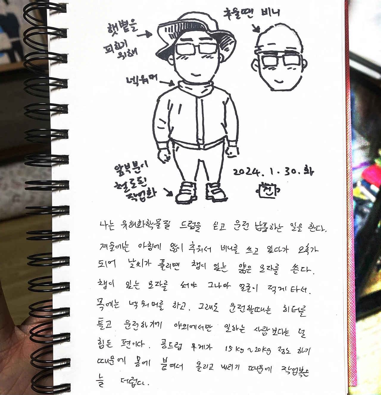 나는 유해화학물질 드럼을 싣고 운전납품하는 일을 한다. 겨울에는 아침에 많이 추워서 비니를 쓰고 있다가 오후가되어 날씨가 풀리면 챙이 있는 얇은 모자를 쓴다. 챙이 있는 모자를 써야 그나마 얼굴이 적게 타서. 목에는 넥워머를 하고. 그래도 운전할때는 히터를 틀고 운전하기에 야외에서만 일하는 사람보다는 덜 힘든 편이다. 공드럼 무게가 15kg~20kg 정도 하기 때문에 몸에 붙여서 올리고 내리기 때문에 작업복은 늘 더럽다.