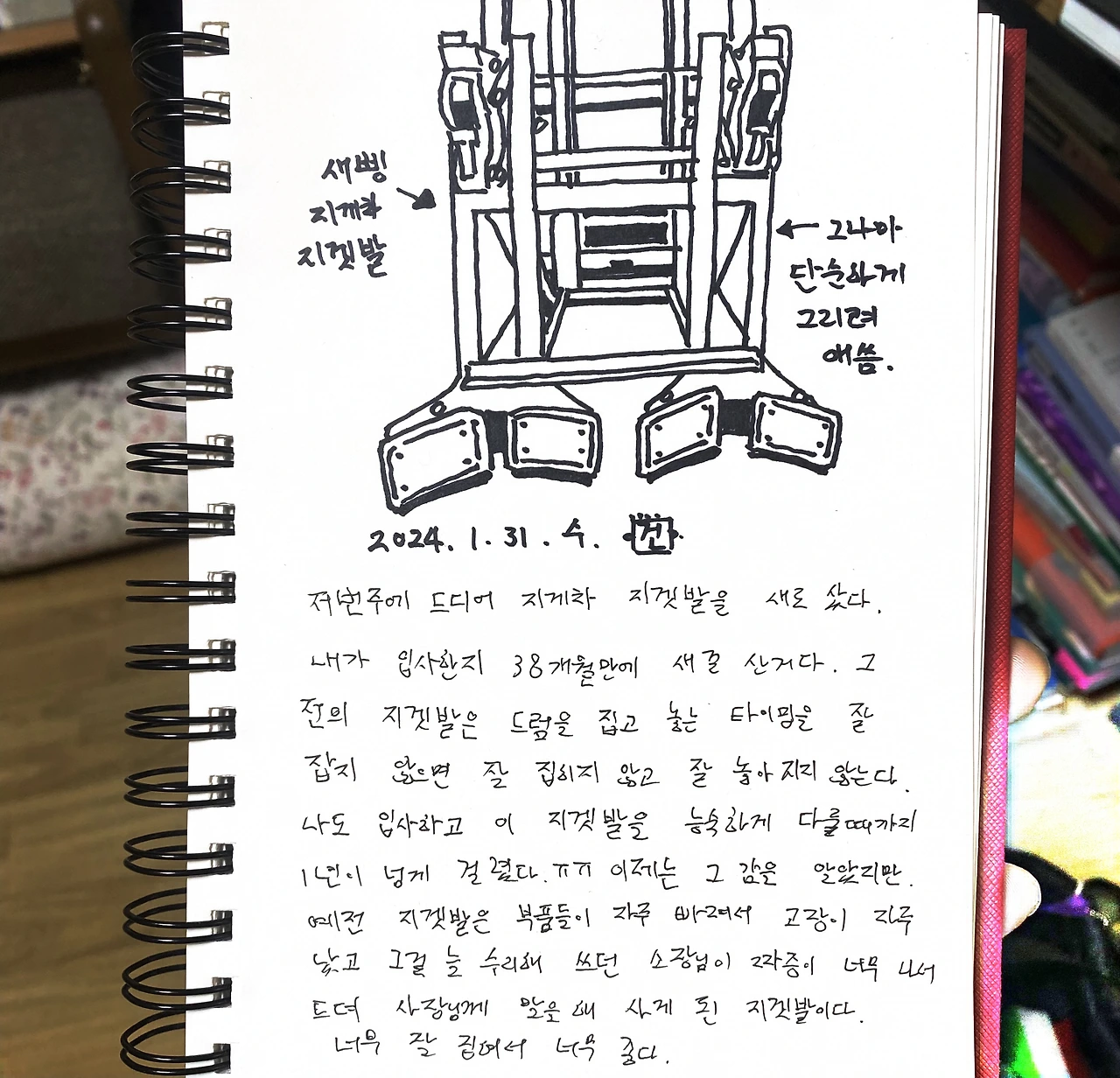 저번주에 드디어 지게차 지겟발을 새로 샀다. 내가 입사한지 38개월만에 새걸 산거다. 그전의 지겟발은 드럼을 집고 놓는 타이밍을 잘 잡지 않으면 잘 집히지 않는다. 나도 입사하고 이 지겟발을 능숙하게 다룰때까지 1년이 넘게 걸렸다. ㅠㅠ 이제는 그 감을 알았지만. 예전 지겟발은 부품들이 자주 빠져서 고장이 자주 났고 그걸 늘 수리해 쓰던 소장님이 짜증이 너무 나서 드뎌 사장님께 말을해 사게 된 지겟발이다. 너무 잘 집혀서 좋다.