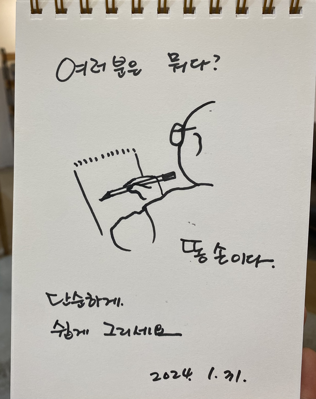 총 13명이 신청하셨는데, 개인사정상 2명이 불참하셨고, 11명이서 수업을 들었다. 네명의 아이와 네명의 엄마도 한쪽을 차지해 주셨고, 다들 재미있으셨던 것 같고, 어른이 되어 그림그리는 즐거움을 처음알게 되었다고 기쁜 마음을 나눠 주시기도 했다. 유치원생 한 아이에게는 그림편지도 선물받았다. 똥손인 자신도 할만하다는 생각이 들었지 수업이 끝나고 바로 여섯명이 똥손그림일기 한권채우기 단톡방에 들어오시겠다고 하셨다. 아이들을 참여시키기 위해 하는 것이 아닌 엄마가 아닌 어른 여성 본인을 위해 2시간 집중하시는 모습이 흐믓했다. 똥손이라고 하시던데, 의외의 그림을 너무 잘 그리는 능력자도 계셨다. 제일 어려워 하신 부분은 몸을 간단하게 귀엽게 그리는 부분. 그래서, 세명의 사진을 보고 시연을 마지막으로 해 드렸다. 얼굴은 크게 목이 얇아야 양쪽 어깨가 좁아지고 몸이 작아진다고 이야기 하면서 설명했다. 길다란 어른의 몸이 이렇게 간단한 비율로 줄어드는 걸 직접 보시는 많이 놀라고 신기해 하셨다. 마지막으로 돌아가면서 느낌을 나누었는데, 아이들 세명은 복붙으로 수줍게 재미있었어요 라는 단답을 해주었는데…그 답만으로 감사했다.