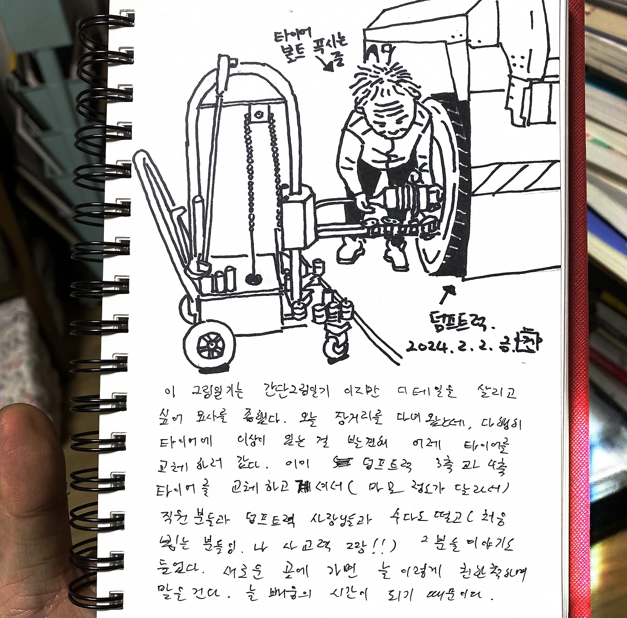 이 그림일기는 간단그림일기 이지만 디테일을 살리고 싶어 묘사를 좀 했다. 오늘 장거리를 다녀왔는데, 다행히 타이어에 이상이 있는 걸 발견해 어제 타이어를 교체하러 갔다. 이미 덤프트럭 3축과 4축 타이어를 교체하고 계셔서(마모 정도가 달라서) 직원분들과 덤프트럭 사장님들과 수다도 떨고(처음 뵙는 분들임.나 사교력 짱!!) 그 분들 이야기도 들었다. 새로운 곳에 가면 늘 이렇게 친한척하며 말을 건다. 늘 배움의 시간이 되기 때문이다.