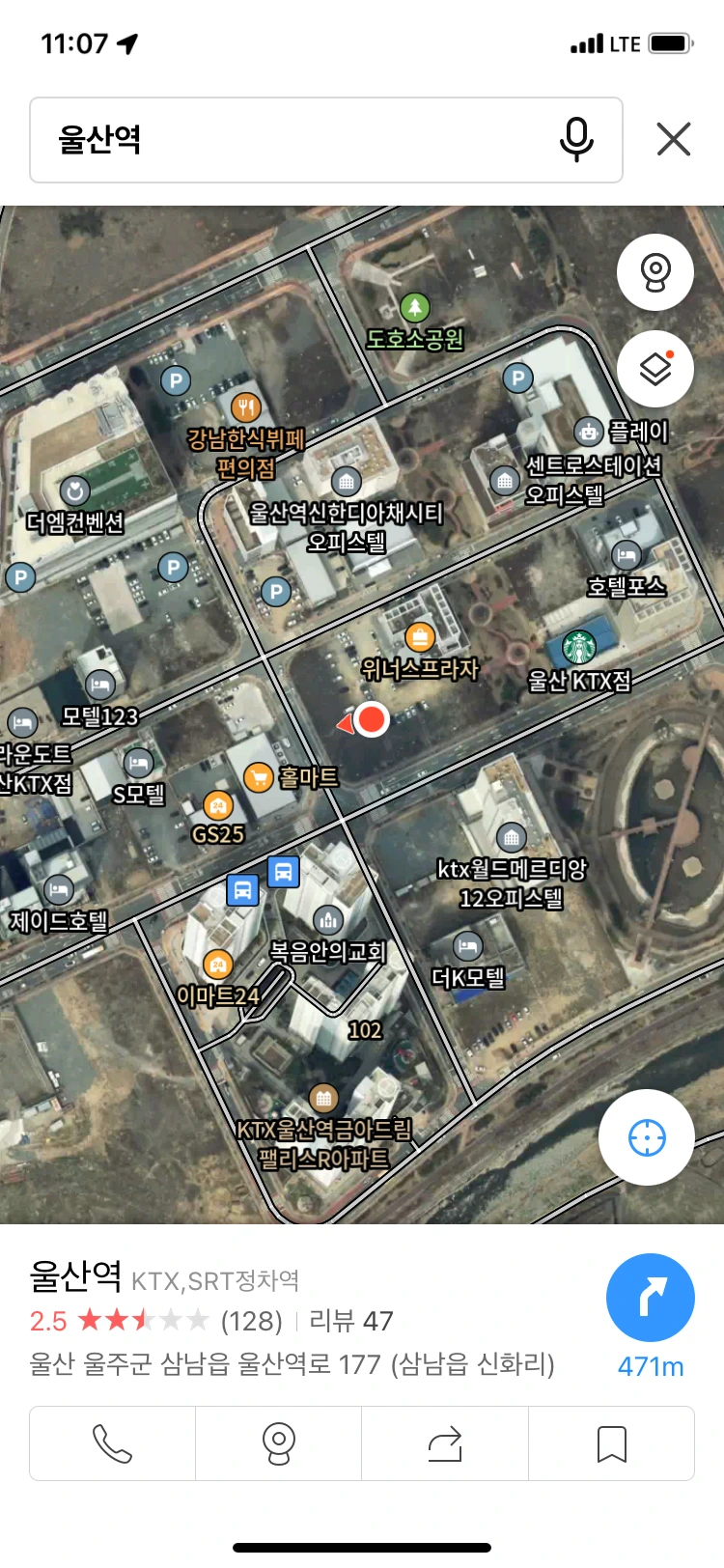 서울을 가려고 11시 23분 기차를 타러 울산역에 왔는데, 이미 공영주차장 입구에 차가 여섯대가 서있는게 아닌가. 기차시간까지는 23분정도 남았고. 차에서 내려 앞차들을 보니 줄이 금방 줄것 같지는 않고, 여기서 기다리다가는 기차를 놓칠것 같아 차를 바로 빼서 주변으로 차를 몰았다. 울산역이 번화가에 있지 않다보니 주변은 차들이 많이는 안다는 곳이고……진흙밭이긴 한데, 무료 주차장인듯 차들이 빼곡이 주차된 곳에 차를 주차하고 핸드폰을 꺼내 내 위치 확인하고 캡쳐. 서둘러 울산역까지 뛰었다. 생활체육인으로써의 체력이 이럴때 발휘되는게 아닐까.(물론 아주 느리게 뜀. 나는 뛰는 속도 빠르지 않음 ㅠㅠ) 여유있게 도착해 기차역에 똥한번 때리고, 시간에 맞춰 기차를 탔다.