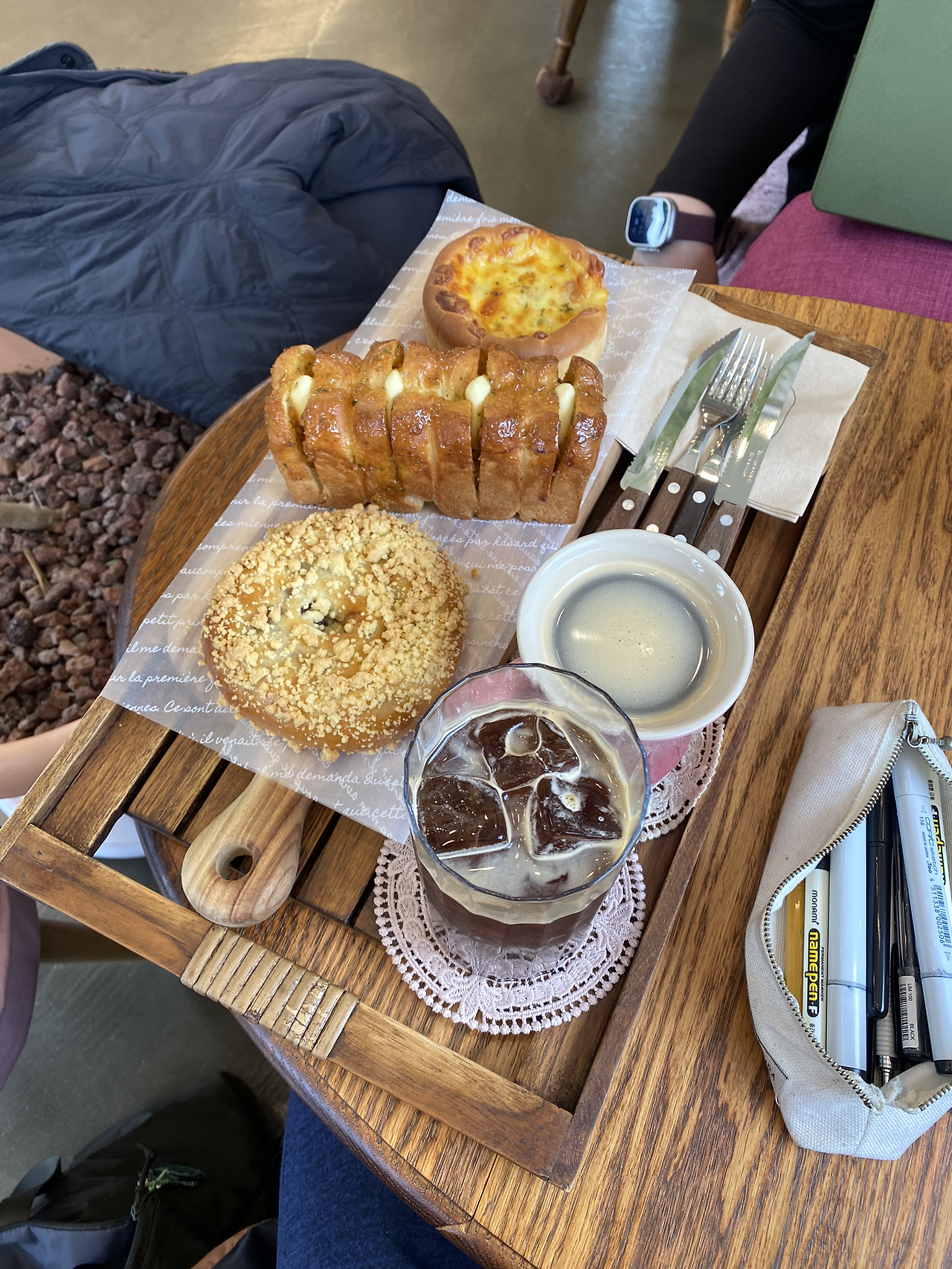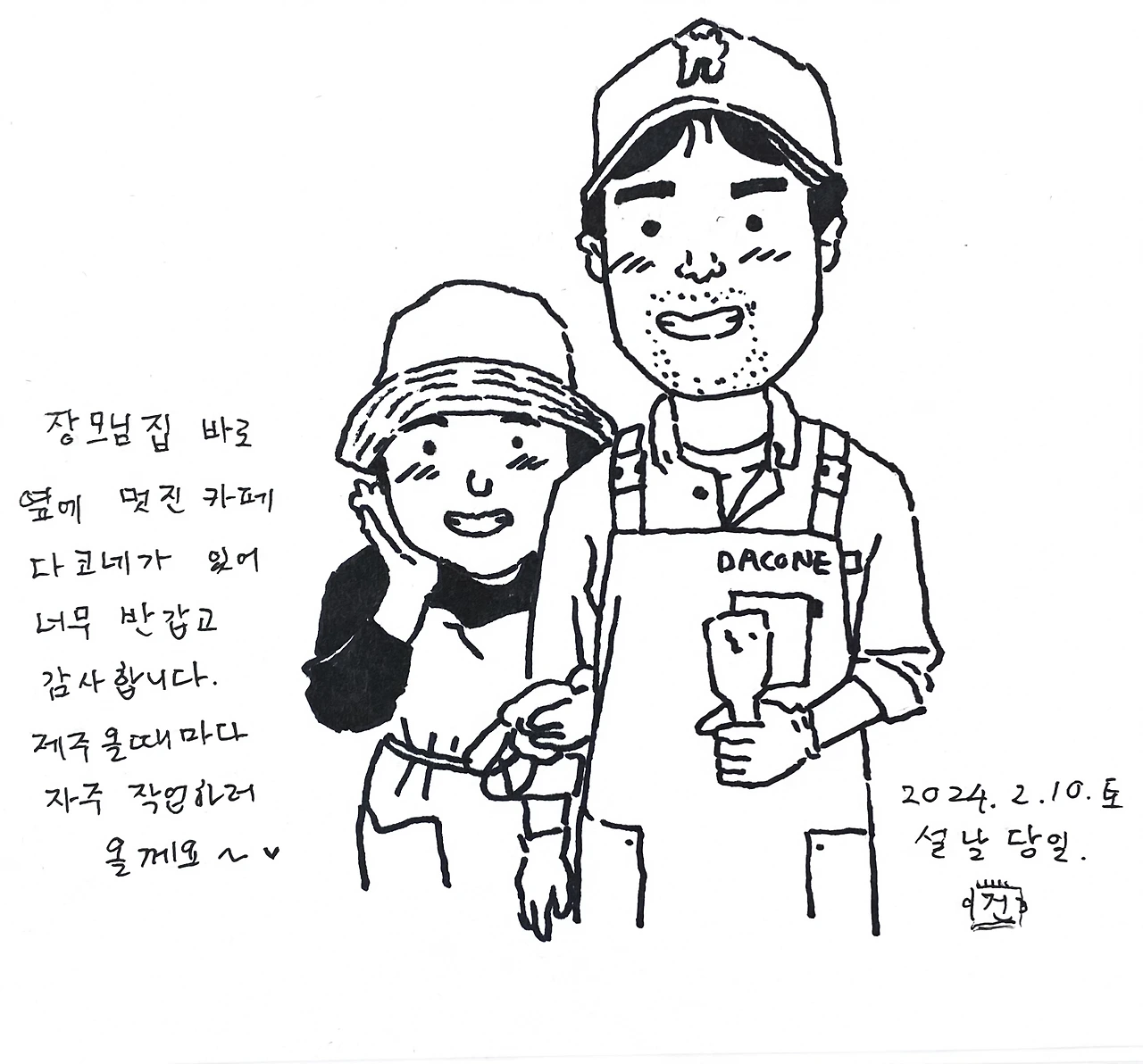 장모님 집에 걸어서 1분거리에 멋진 카페겸 빵집 다코네가 있다. 짝지는 혼자 내려왔을때 작업하러 종종 들리던 곳으로 아침에 분리수거하러 폐지들고 카페를 지나갈때 보디 설날 오늘 부터 영업을 한다는게 아닌가. 집에서 장모님이 끊여주신 만두 떡국을 먹고, 11시즈음에 슬리퍼를 신고 다코네에 왔다. 카페도 너무 아늑하고 멋지고, 빵도 맛있다. 장모님 집 바로 옆에 있어주시는게 너무 감사해서 사장님 두분을 찍어 그림을 그려 선물해 드렸다. 새해 복 많이 받으셔용^^