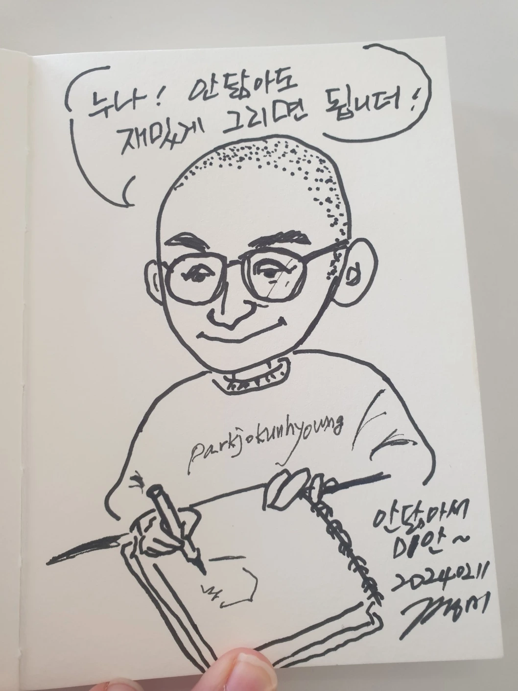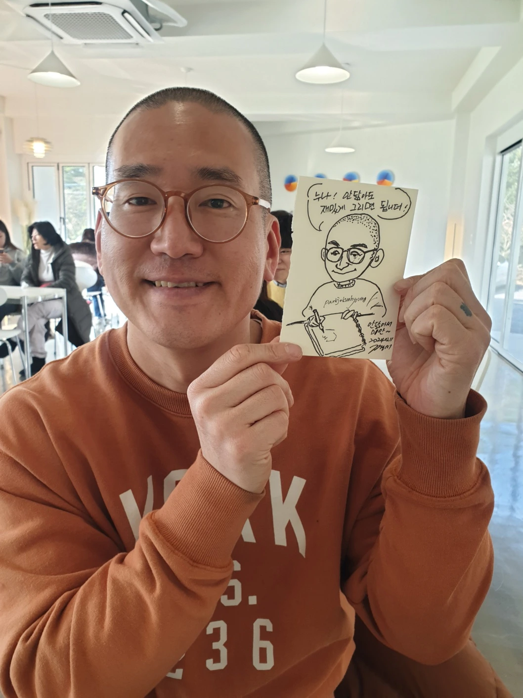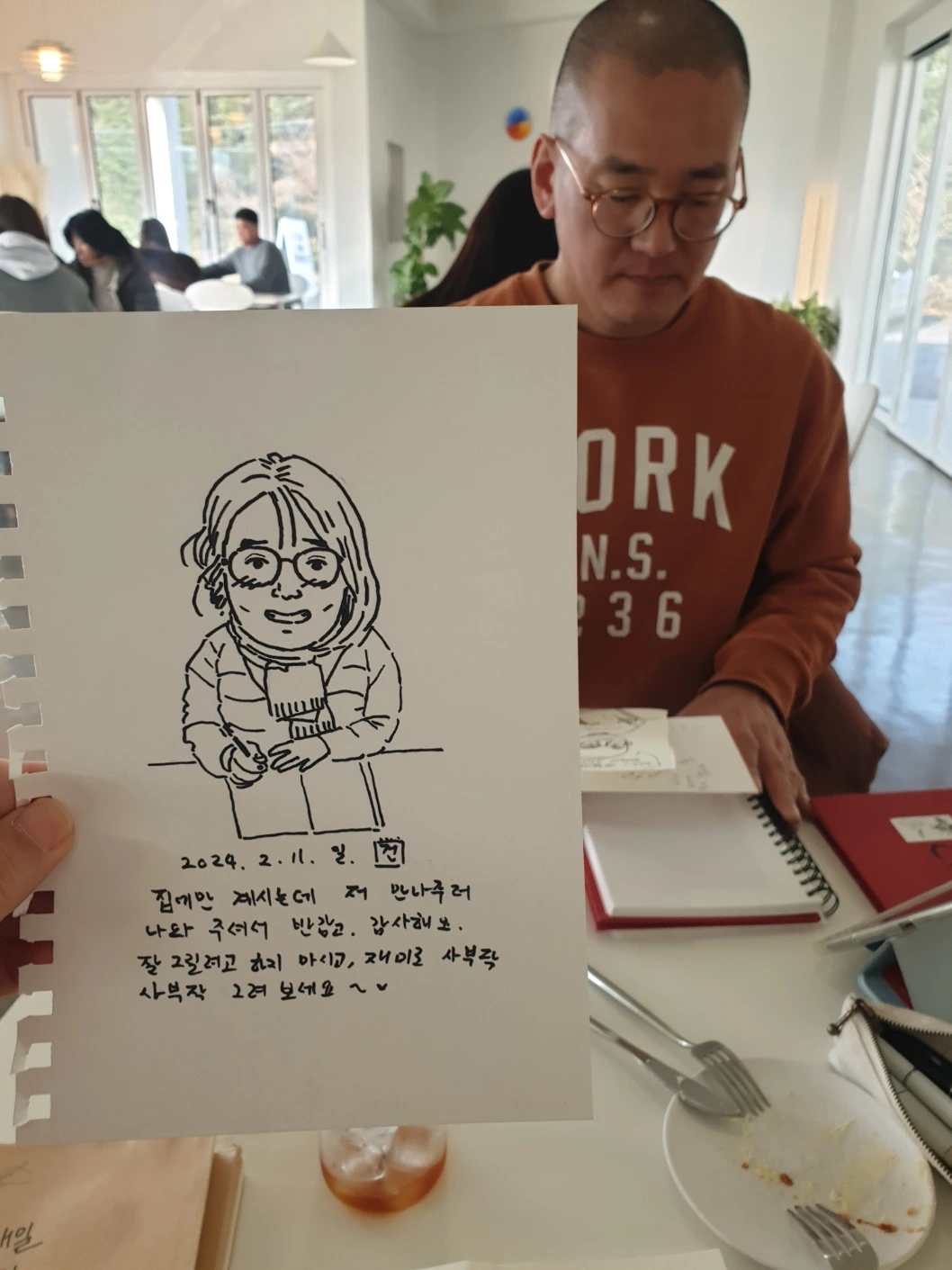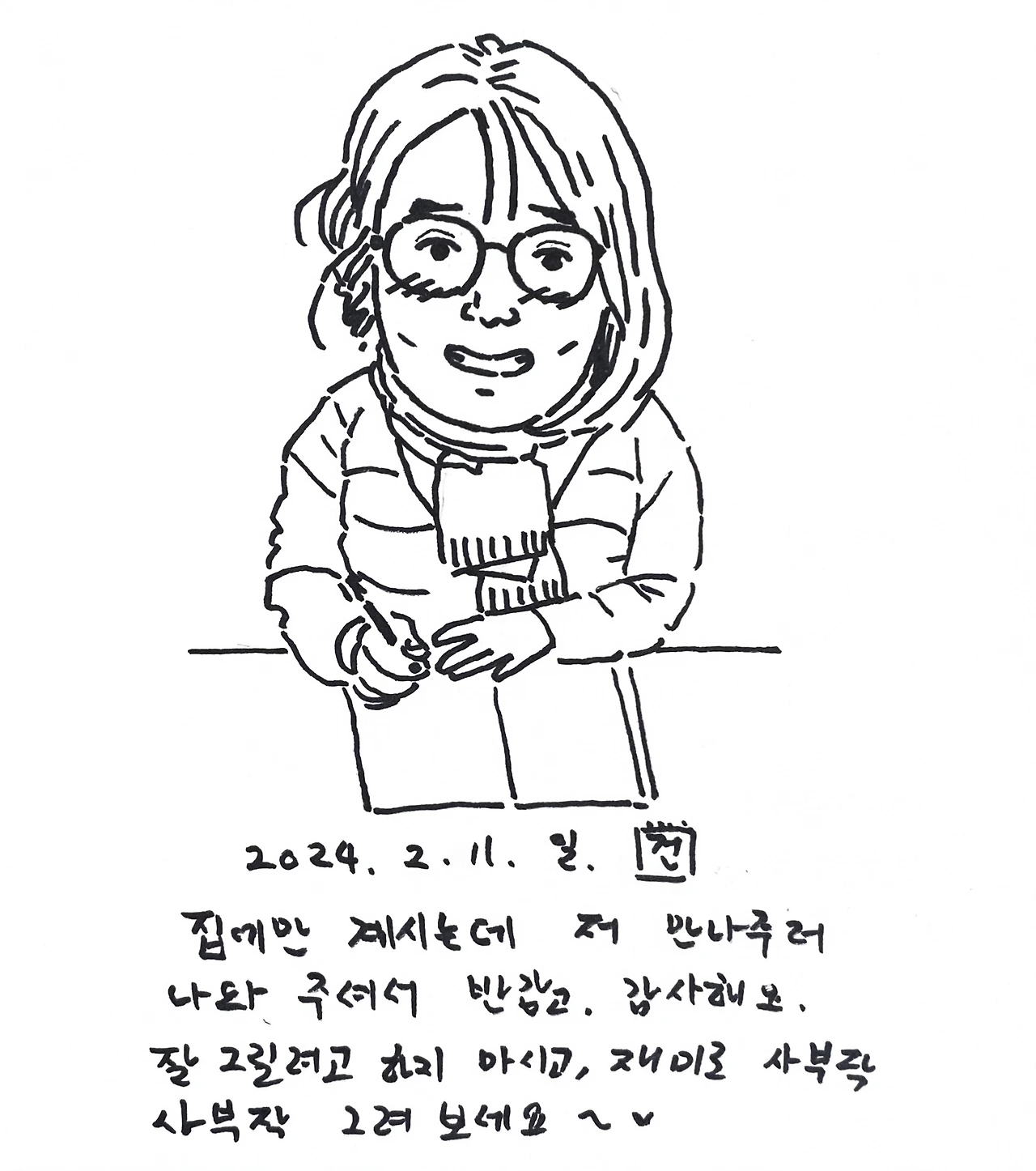 서로 그려주기도 하고 헤어지기 전에 카페 사진을 같이 찍어서 나중에 집에서 그려서 올리기로 약속했다. 나는 관심이있거나 이야기가 있지 않은 대상물은 그리고 싶은 마음이 덜한 편이라…..요즘 그림일기 그리는 그림체로 간단히 그림을 그렸다. 다른 사람 뒷다마 만큼 대동단결하는게 있을까. 신나게 사람들 뒷다마도 까고 이런저런 이야기를 편하게 나누었다. 카페 문을 일찍 닫는 바람에 인사를 하고 헤어졌다. 짝지랑 동갑인 누나인데, 짝지에게 전해달라고 하며 당근 샌드를 선물해주셨다. 나는 부산에서 내려가신지 몇년 안되신줄 알았는데. 제주 생활 10년차라고 하셨다. 페친으로 또 보고 있다가 우리 다음에 또 반갑게 만나요.
