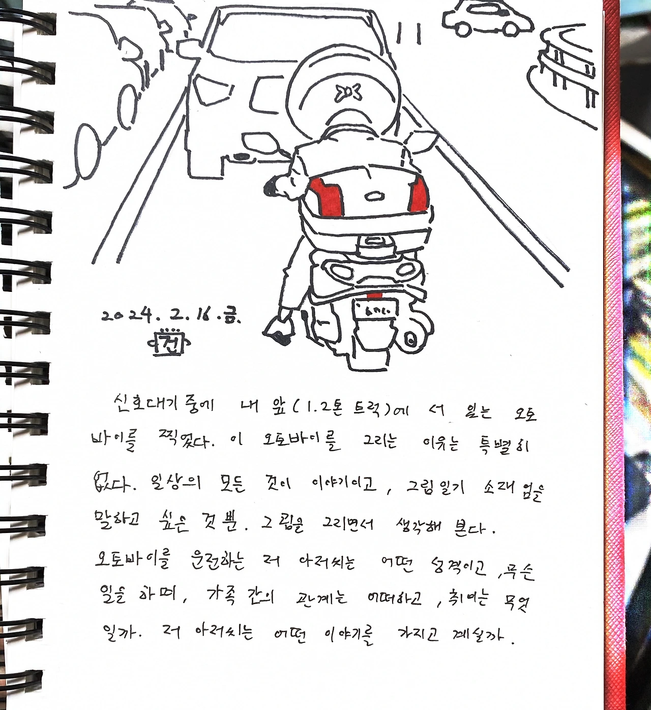 신호대기중에 내 앞(1.2톤 트럭)에 서 있는 오토바이를 찍었다. 이 오토바이를 그리는 이유는 특별히 없다. 일상의 모든 것이 이야기이고, 그림일기 소재임을 말하고 싶은 것 뿐. 그림을 그리면서 생각해 본다. 오토바이를 운전하는 저 아저씨는 어떤 성격이고, 무슨 일을 하며, 가족간의 관계는 어떠하고 취미는 무엇일까. 저 아저씨는 어떤 이야기를 가지고 계실까.