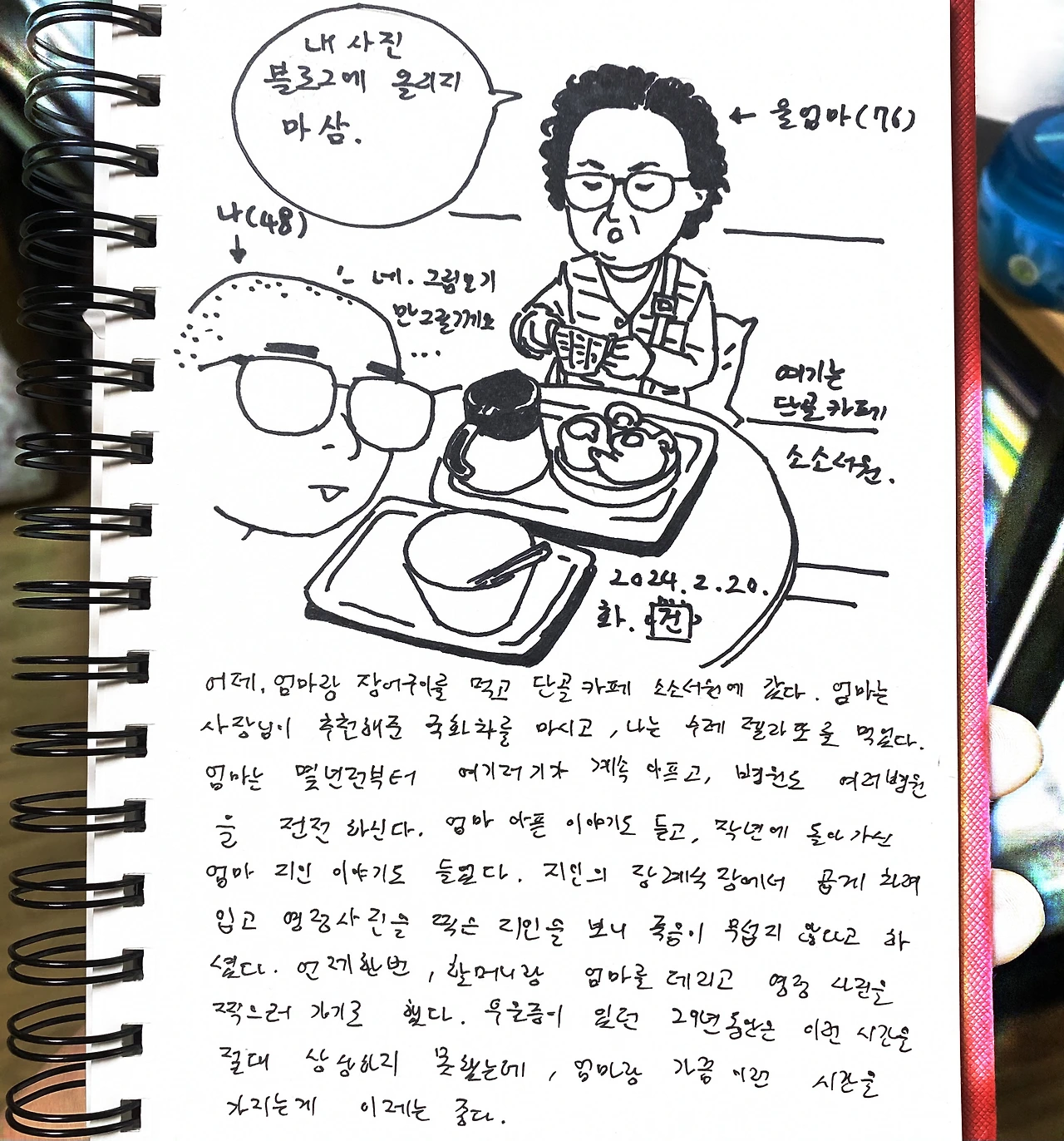 어제, 엄마랑 장어구이를 먹고 단골 카페 소소서원에 갔다. 엄마는 사장님이 추천해준 국화차를 마시고, 나는 수제 젤라또 아이스크림을 먹었다. 엄마는 몇년전부터 여기저기가 계속 아프시고, 병원도 여러병원들을 전전 하신다. 엄마 아픈 이야기도 듣고, 작년에 돌아가신 엄마 지인이야기도 들었다. 지인의 장례식장에서 곱게 차려 입고 영정사진을 찍은 지인을 보니 죽음이 무섭지 않다고 하셨다. 언제한번, 할머니랑 엄마를 데리고 영정 사진을 찍으러 가기로 했다. 우울증이 있던 29년동안은 이런시간을 절대 상상하지 못했는데, 엄마랑 가끔이런 시간을 가지는게 이제는 좋다.