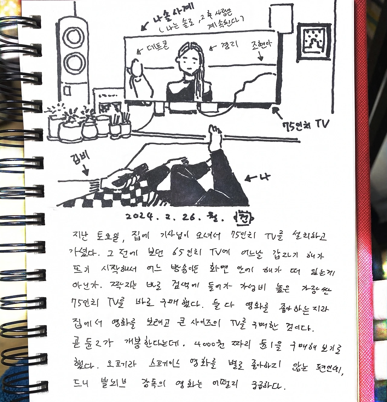 지난 토요일, 집에 기사님이 오셔서 75인치 TV를 설치하고 가셨다. 그전에 보던 65인치 TV에 어느날 갑자기 해가 뜨기 시작해서 어느방송이든 화면 안에 해가 떠 있는게 아닌가. 짝지는 바로 검색에 들어가 가성비 높은 가장싼 75인치 TV를 바로 구매했다. 둘다 영화를 좋아하는지라 집에서 영화를 보려고 큰 사이즈의 TV를 구매한 것이다. 곧 듄2가 개봉한다는데, 4000원짜리 듄1 을 구매해 보기로 했다. 오페라 스페이스 영화를 별로 좋아하지 않는 편인데, 드니 빌뇌브 감독의 영화는 어떨지 궁금하다.