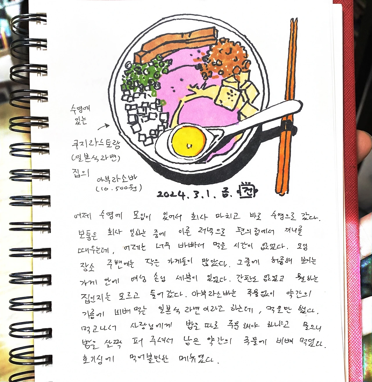 어제 수영에 모임이 있어서 회사 마치고 바로 수영으로 갔다. 보통은 회사 일하는 중에 이른 저녁으로 편의점에서 끼니를 때우는데, 어제는 너무 바빠서 먹을 시간이 없었다. 모임 장소 주변에는 작은 가게들이 많았다. 그중에 허름해 보이는 가게 안에 여성 손님 세분이 있었다. 간판도 없었고 뭘하는 집인지는 모르고 들어갔다. 아부라소바는 국물없이 약간의 기름에 비벼먹는 일본식 라면이라고 하는데, 먹을만 했다. 먹고나서 사장님에게 밥을 따로 주문해야 하냐고 물으니 밥을 살짝 퍼 주셔서 남은 약간의 국물에 비며먹었다. 호기심에 먹어볼만한 메뉴였다.
