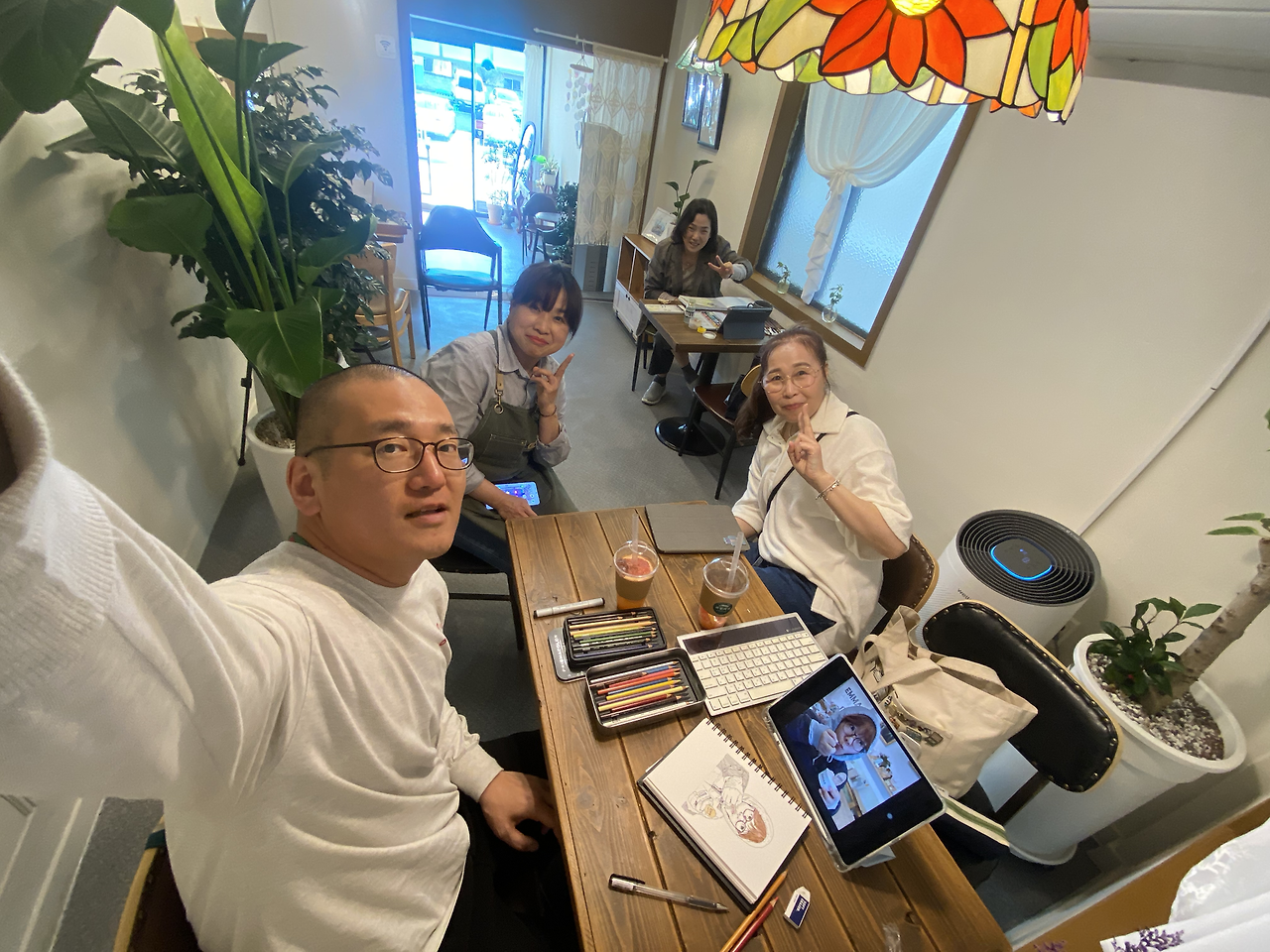 오늘은 노동절, 쉬는 날이라 그림 작업을 하려고 오봉살롱 대표님에게 전화를 드렸더니 열려 있다고 해서 가서 그림을 그렸다. 그림 그리다가 문득 나의 최고 그림 애제자 김정임 선생님이 근처에 사시는게 생각이 나서 문자를 드렸더니, 유키(14살 노견) 산책 시키시다가 집에 다시 들어가 그림 도구를 챙겨 나타나셨다.