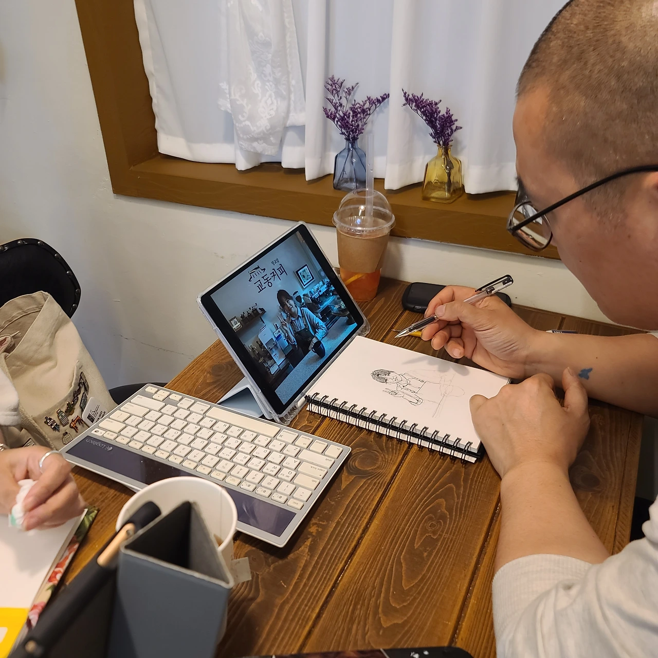 최근 나도 그림 작가로 다시 정체화하며 인물펜드로잉으로 특화해서 작업을 조금씩 하기 시작했는데, 정임쌤이 이제 든든한 동료가 작가가 되신것 같아 기분이 무지 뿌듯하다. 수채화는 수업을 하셔도 될만큼의 충분한 실력이시다. 다만 정임쌤 말씀처럼 본인의 건강 생각하시면서 내킬때 조금씩 드로잉 수업도 해 보셨으면 좋겠다. 수다 떨며 한참을 그림을 그리다가 양산 어반스케쳐서 멤버 한분이 교동에 카페를 여셨다고 해서 거기로 옮겨서 그림을 그리기로 했다. 어반스케치는 현장에서 실물을 보고 바로 그리는 스타일로 주로 풍경을 그리고 수채화로 채색하는 경우가 많은 그림 스타일로 내가 주로 작업하는 인물펜드로잉 과는 분야가 달라서 나는 거기서 활동하진 않는다.