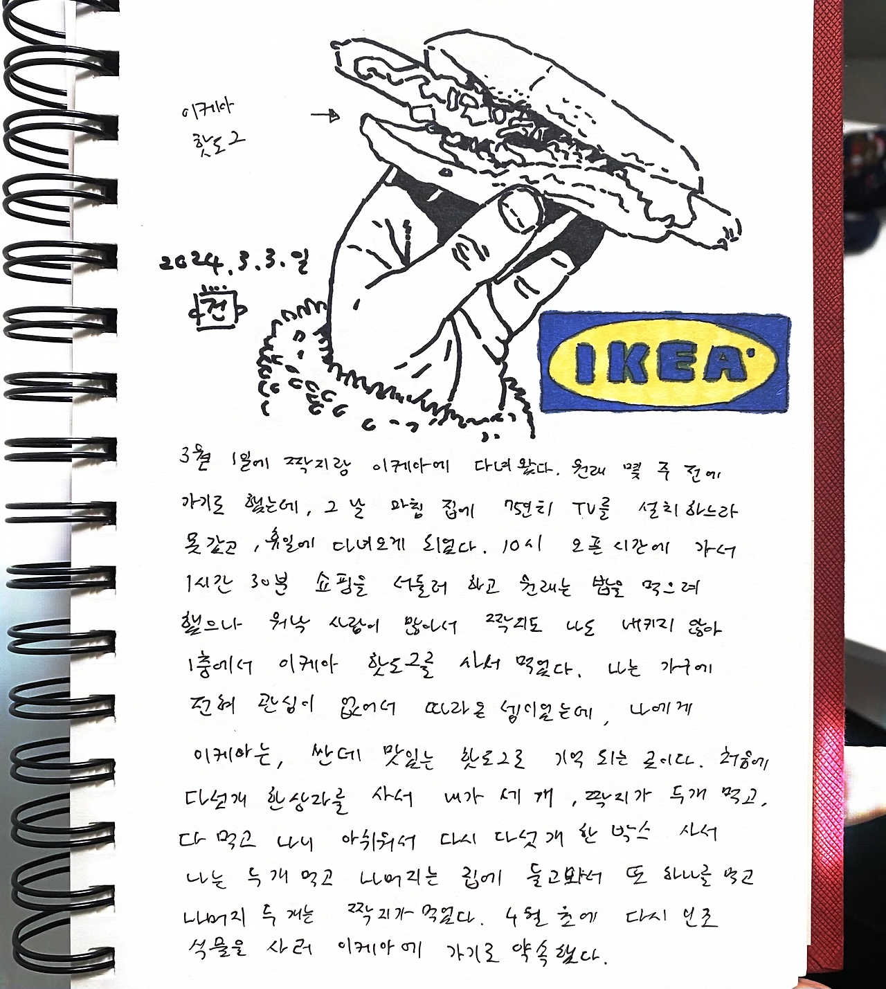 3월 1일에 짝지랑 이케아에 다녀왔다. 원래 몇 주 전에 가기로 했는데, 그날 마침 집에 75인치 티비를 설치하느라 못갔고 휴일에 다녀오게 되었다. 10시 오픈 시간에 가서 1시간 30분 쇼핑을 서둘러 하고 원래는 밥을 먹으려 했으나 워낙 사람이 많아서 짝지도 나도 내키지 않아 1층에서 이케아 핫도그를 사서 먹었다. 나는 가구에 전혀 관심이 없어서 따라온 셈이었는데, 나에게 이케아는 싼데 맛있는 핫도그로 기억되는 곳이다. 처음에 다섯개 한상자를 사서 내가 세개, 짝지가 두개먹고, 다 먹고 나니 아쉬워서 다시 다섯개 한박스 사서 나는 두개 먹고 나머지는 집에 들고와서 또 하나를 먹고 나머지 두개는 짝지가 먹었다. 4월 초에 다시 인조 식물을 사러 이케아에 가기로 약속했다.