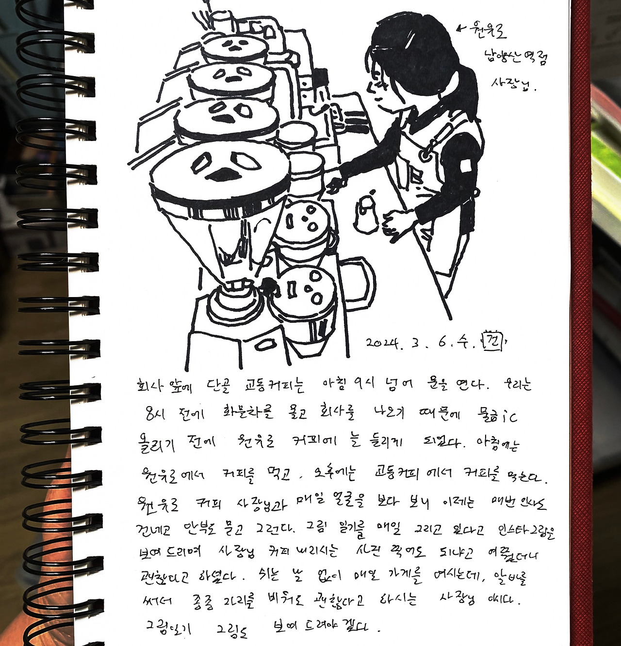 회사앞에 단골 교동커피는 아침 9시 넘어 문을 연다. 우리는 8시 전에 화물차를 몰고 회사를 나오기 때문에 물금 ic 올리기 전에 원유로 커피에 늘 들리게 되었다. 아침에는 원유로에서 커피를 먹고, 오후에는 교동커피에서 커피를 먹는다. 원유로 커피 사장님과 매일 얼굴을 보다 보니 이제는 매번 인사도 건네고 안부도 묻고 그런다. 그림 일기를 매일 그리고 있다고 인스타 그림을 보여드리며 사장님 커피 내리시는 사진 찍어도 되냐고 여쭸더니 괜찮다고 하셨다. 쉬는 날 없이 매일 가게를 여시는데, 알바를 써서 종종 자리를 비워도 괜찮다고 하시는 사장님이시다. 그림일기 그림도 보여드려야 겠다.