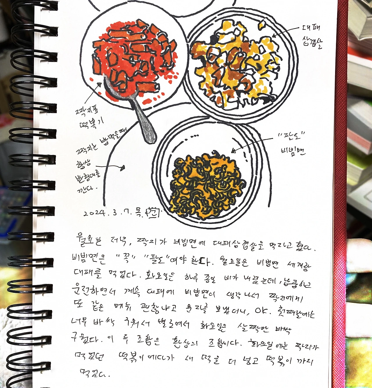 월요일 저녁 짝지가 비빔면에 대패삼겹살을 먹자고 했다. 비밈면은 꼭 “팔도”여야 한다. 월요일은 비빔면 세개랑 대패를 먹었다. 화요일은 하루종일 비가 내렸는데, 납품하고 운전하면서 계속 대패에 비빔면이 생각나서 짝지에게 또 같은 메뉴 괜찮냐고 문자를 보냈더니, OK. 첫째날에는 너무 바싹 구워서 별로여서 화요일은 살짝만 바싹 구웠다. 이 두 조합은 환상의 조합이다. 화요일에는 짝지가 먹었던 떡복이에다가 새 떡을 더 넣고 떡뽁이까지 먹었다.