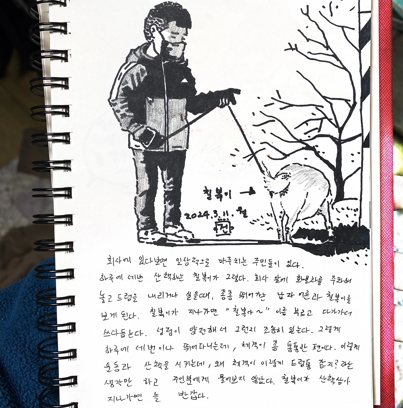 회사에 있다보면 일상적으로 마주치는 주변 주민들이 있다. 하루에 세번 산책하는 칠복이가 그렇다. 회사앞에 화물차를 주차해 놓고 드럼을 내리거나 실을때, 종종 뛰어가는 남자어른과 칠복이를 보게 된다. 칠복이가 지나가면 “칠복아~” 이름 부르고 다가가서 쓰다듬는다. 성정이 얌전해서 그런지 조용히 있는다. 그렇게 하루에 세번이나 뛰어다니는데, 체격이 좀 통통한 편이다. 이렇게 운동과 산책을 시키는데, 왜 체격이 이렇게 드럼통 같지? 라는 생각만 하고 주인분에게 물어보진 않았다. 칠복이가 산책삼아 지나가면 늘 반갑다.