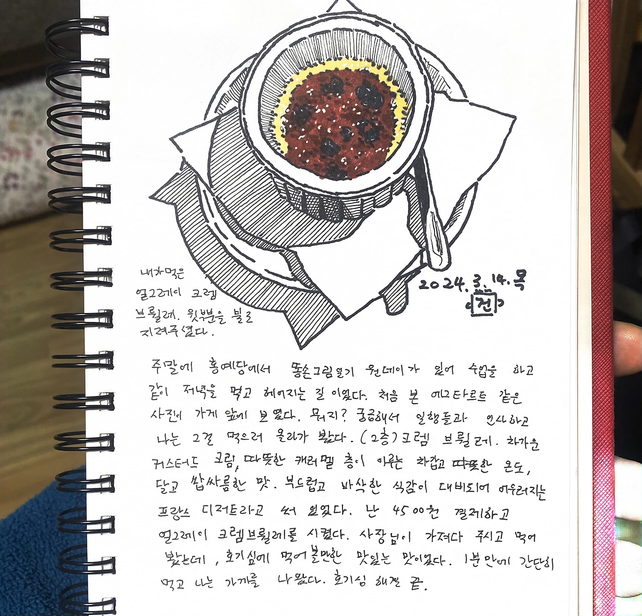 주말에 홍예당에서 똥손그림일기 원데이가 있어 수업을 하고 같이 저녁을 먹고 헤어지는 길이었다. 처음 본 에그타르트같은 사진이 가게 앞에 보였다. 뭐지? 궁금해서 일행들과 인사하고 나는 그걸 먹으러 올라가 봤다.(2층) 크렘 브륄레. 차가운 커스터드 크림, 따뜻한 캐러멜 층이 이루는 차갑고 따뜻한 온도, 달고 쌉싸름한 맛. 부드럽고 바삭한 식감이 대비되어 어우러지는 프랑스 디저트 라고 써 있었다. 난 4500원 결제하고 얼그레이 크렘브륄레를 시켰다. 사장님이 가져다주시고 먹어봤는데, 호기심에 먹어볼만한 맛있는 맛이었다. 1분만에 간단히 먹고 나는 가게를 나왔다. 호기심 해결 끝.