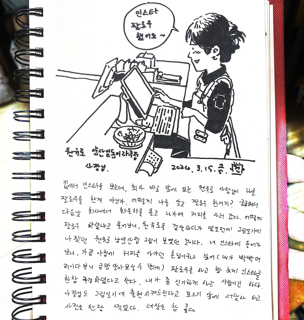 집에서 인스타를 보는데, 회사 바로 앞에 있는 원유로 사장님이 나를 팔로우를 한게 아닌가. 어떻게 나를 알고 팔로우 한건지? 궁금해서 다음날 회사에서 화물차를 몰고 나가며 커피를 사러 갔다. 어떻게 팔로우 하셨냐고 물어보니, 원유로를 검색하다가 몇일전에 그림일기에 나왔던 원유로 남양산역점 그림이 보였던 것이다. 내 인스타에 들어가보니, 가끔 아침에 커피를 사가던 손님이구나 싶어(내가 빡빡머리이다보니 금방 알아보실수 밖에) 팔로우를 하고 밤늦게 내 인스타를 한참 구경하셨다고 한다. 내가 좀 신기하게 사는 사람이긴 하다. 사장님도 그림일기에 출현시켜드린다고 포스기 앞에 서달라 하고 사진을 한장 찍었다. 세상은 참 좁다.