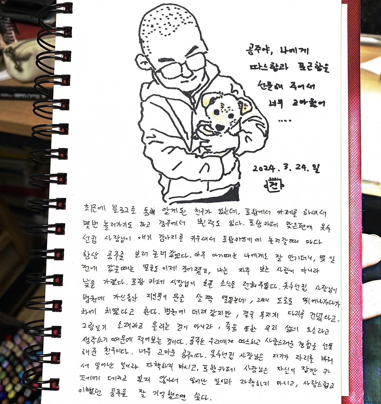 최근에 블로그를 통해 알게된 친구가 있는데, 포항에서 카페를 하셔서 몇번 놀러가기도 하고 경주에서 뵌적도 있다.포항카페 맞은편에 옷수선집 사장님이 애기 강아지를 키우셔서 포항카페에 놀러갈때 마다 항상 공주를 보러 놀러갔었다. 아주 아기때는 나에게도 잘 안기더니, 몇 일 전에 갔을때는 얼굴도 이제 길어졌고, 나는 자주 보는 사람이 아니라 낯을 가렸다. 포항카페 사장님이 슬픈 소식을 전해주었다. 옷수선집 사장님이 병원에 가신동안 지인분이 문을 살짝 열었는데, 그때 도로로 뛰어나가다가 차에 치였다고 한다. 병원에 데려갔지만, 결국 무지개다리를 건넜다고. 그림일기 소재라고 올리는 것이 아니라, 죽음또한 우리 삶의 하나의 요소라고 생각하기 때문에 적어보는 것이다. 공주는 우리에게 따스하고 사랑스러운 경험을 선물해준 친구이다. 너무 고마운 공주이다. 옷수선집 사장님은 자기가 자리를 비워서 일어난 일이라 자책하지 마시고, 포항카페 사장님은 자신이 잠깐 카페에 데리고 있지 않아서 일어난 일이라 자책하지 마시고, 사랑스럽고 이뻤던 공주를 잘 기억했으면 싶다.