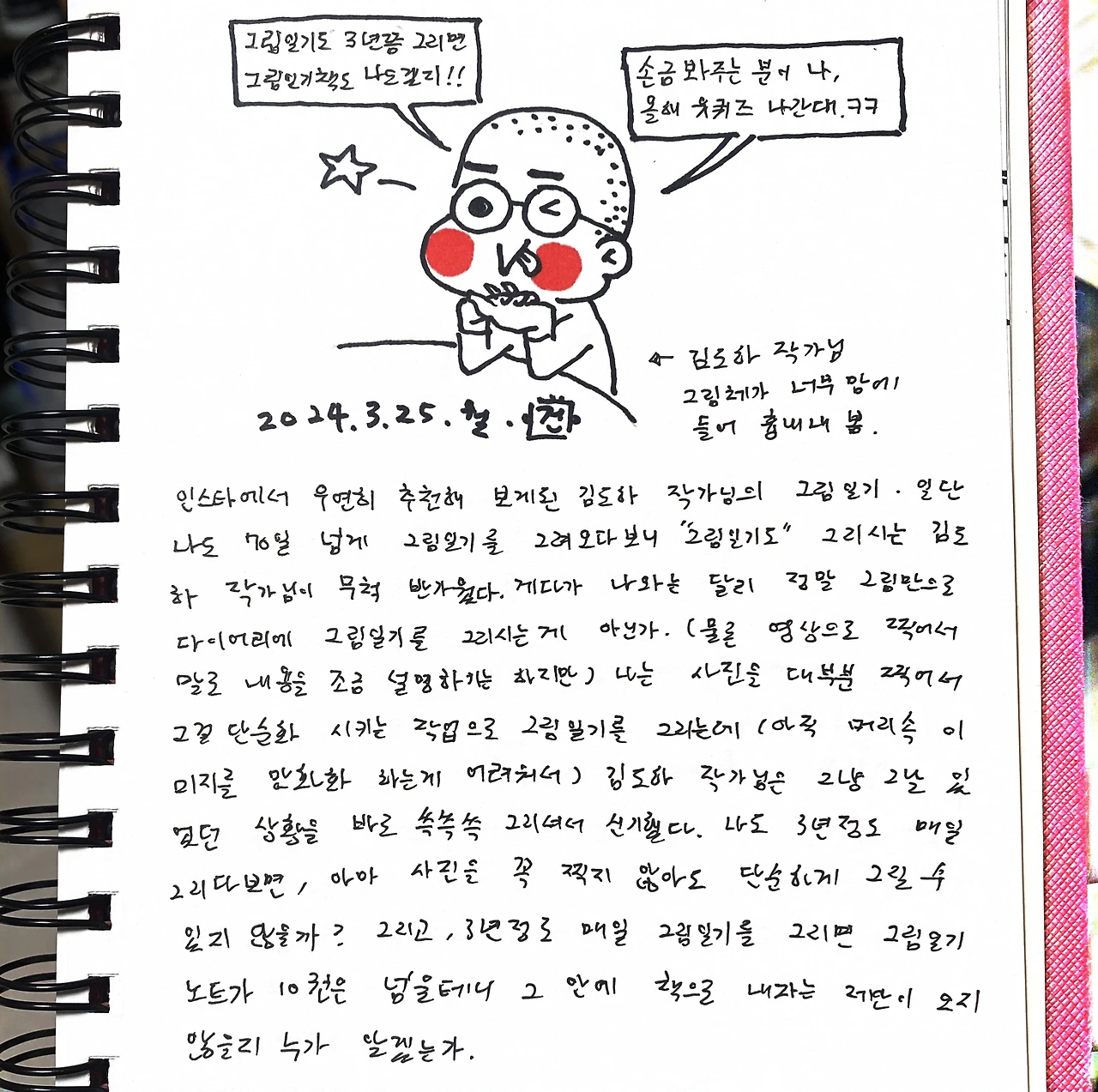 인스타에서 우연히 추천해 보게된 김도하 작가님의 그림일기. 일단 나도 70일 넘게 그림일기를 그려오다보니 그림일기도 그리시는 김도하 작가님이 무척 반가웠다. 게다가 나와는 달리 정말 그림만으로 다이어리에 그림일기를 그리시는게 아닌가.(물론 영상으로 찍어서 말로 내용을 조금 설명하기는 하지만) 나는 사진을 대부분 찍어서 그걸 단순화 시키는 작업으로 그림일기를 그리는데(아직 머리속 이미지를 만화화 하는게 어려워서) 김도하 작가님은 그냥 그날 있었던 상황을 바로 쓱쓱쓱 그리셔서 신기했다. 나도 3년정도 매일 그리다보면, 아마 사진을 꼭 찍지 않아도 단순하게 그릴수 있지 않을까? 그리고, 3년정도 매일 그림일기를 그리면 그림일기 노트가 10권은 넘을테니 그 안에 책으로 내자는 제안이 오지 않을지 누가 알겠는가.