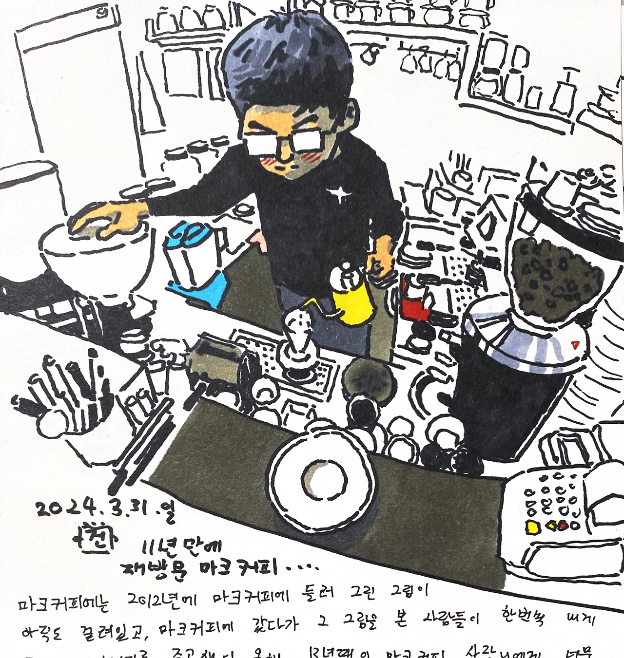 마크커피에는 2012년에 마크커피에 들러 그린 그림이 아직도 걸려있고, 마크커피에 갔다가 그 그림을 본 사람들이 한번씩 내게 문자나 메세지를 주곤했다. 올해 13년째인 마크커피 사장님에게 너무 고마운 마음이 들어 들려야지 생각만 하다가 드디어 11년만에 재방문했다. (2013년에는 혼자 놀러가서 사장님 그림을 그려서 선물해 드렸다.) 그때의 눅눅해진 종이에 그려진 그림을 보니 세월이 느껴져서 신기하고 좋았다. 그리고, 지금의 그림은 또 얼마나 많이 달라졌나. 그래서, 감사의 마음으로 1시간 30분 걸려 애정을 담아 그린 마크커피 가게 모습을 선물로 드리고 왔다. 3시간 넘게 머물렀는데, 어른들의 놀이터같아서 너무나 신나는 시간이었다. 종종 가게될 거 같다.