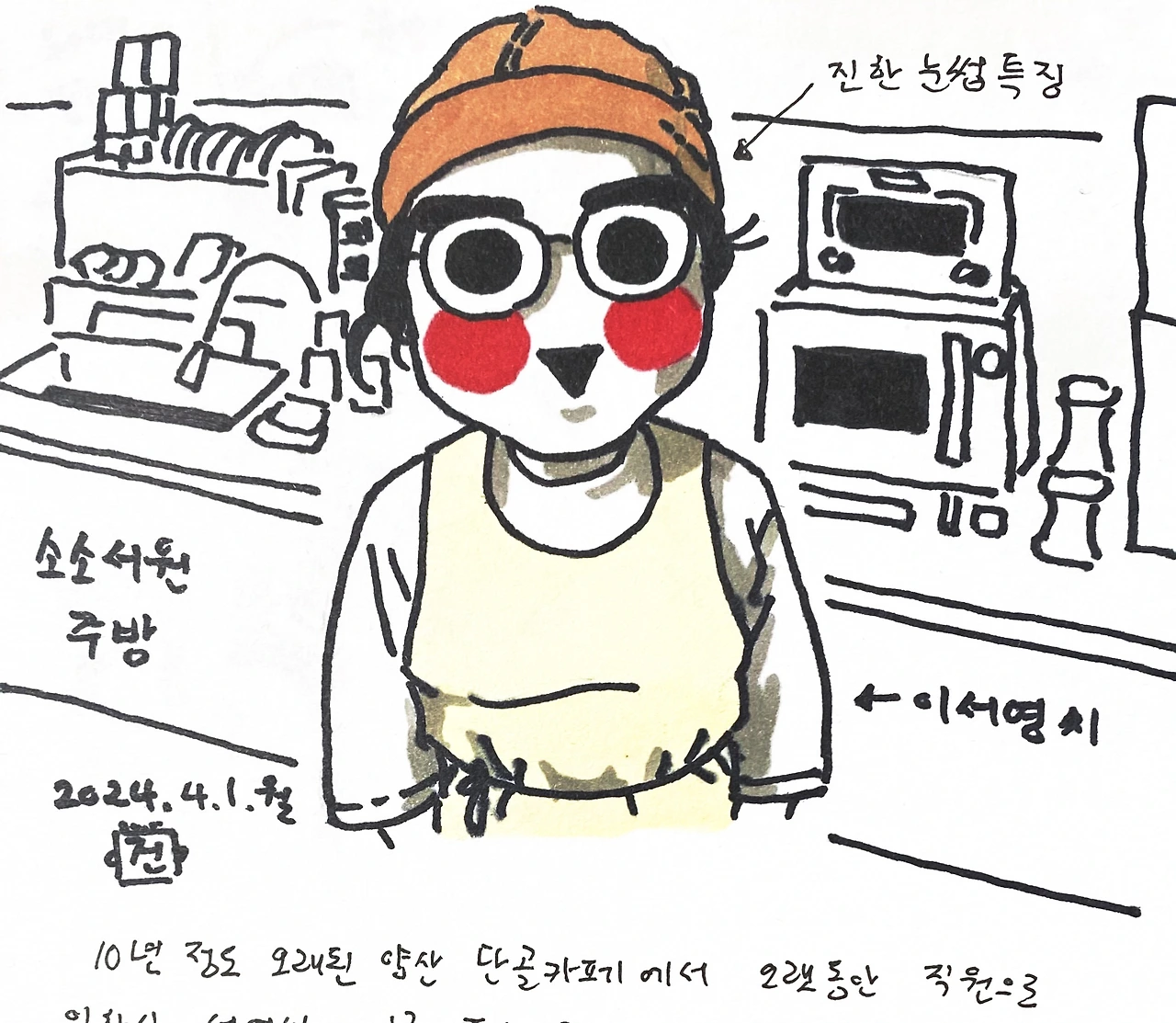 10년정도 오래된 양산 단골카페에서 오랫동안 직원으로 일하신 서영씨. 지금 똥손그림일기 단톡방에서 같이 그림일기를 그리고 있는 멤버시기도 하다. 열심히 그려온 그림일기 노트를 얼마전에 분실하셔서(ㅠㅠ) 그림일기 노트는 집에만 두신다고 했다.소소서원에 놀러 갔다가 짧게 인물 간단하게 그리는 법 특강(?)도 해 드렸다. 푸바오를 좋아해서 용인에도 다녀오신 적이 있고, 야구를 좋아하는 팬이기도 하시다. (그림일기를 통해 알게된 사실들) 언젠가 자기만의 카페를 차릴꿈을 가지고 계시다.