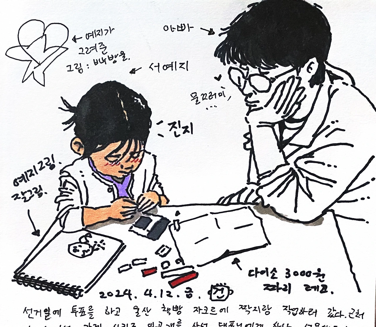 선거일에 투표를 하고 울산 책빵자크르에 짝지랑 작업하러 갔다. 근처 다이소에서 가게 시리즈 일곱개를 사서 대표님에게 하나 선물해드리고, 같이 조립을 하고 있는데, 손님중에 아이 손님이 관심을 보인다고 대표님이 말씀하셔서 예지에게 선물로 주었다. 옆에서 엄마가 잘 알려주고 천천히 조립해 결국 완성했다. 예지가 레고 조립하는 모습을 그림일기로 미리 그려 보여주었더니, 너무 좋아했다. 나의 어떤 점이 마음에 들었는지, 오늘 자기 집에서 자고가면 안되냐고 귓속말로 나에게 말했다. 울짝지에게 허락 받아야 한다고 하니 짝지에게 가서 진지하게 말을 했다. 부모님들이 당황하며 집이 청소가 안되어서 다음에 초대하자고 했다. 5월 10일이 자기 생일인데 그때 또 올수 없냐고 귓속말로 내게 말하기도 했다. 예지는 자기가 그린 그림도 내게 선물로 주었다. 디자이너가 꿈인 아이였다.