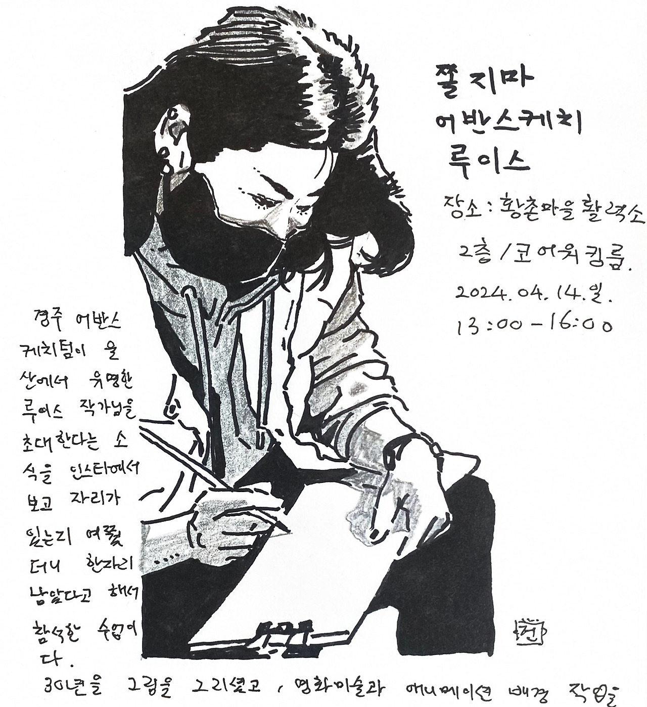 경주 어반스케치팀이 울산에서 유명한 루이스 작가님을 초대한다는 소식을 인스타에서 보고 자리가 있는지 여쭸더니 한자리 남았다고 해서 참석한 수업이다. 30년을 그림을 그리셨고, 영화미술과 애니메이션 배경 작업을 해오셨으니 내공이 대단하시다.(강의 듣고 오늘 처음 앎) 수채화 시연을 정말 꼼꼼하게 디테일하게 설명하면서 보여주셔서 정말 큰 공부가 되었다. (물론 서서 1시간 40분 이상을 관전을 하니 피로감이 상당하긴 했다.)루이스 작가님 유투브에 수채화채색 영상들이 있으니 좀 찾아봐야겠다는 생각이 들었다. 내일 한번 집에서 비스무리하게 흉내내 봐야겠다.