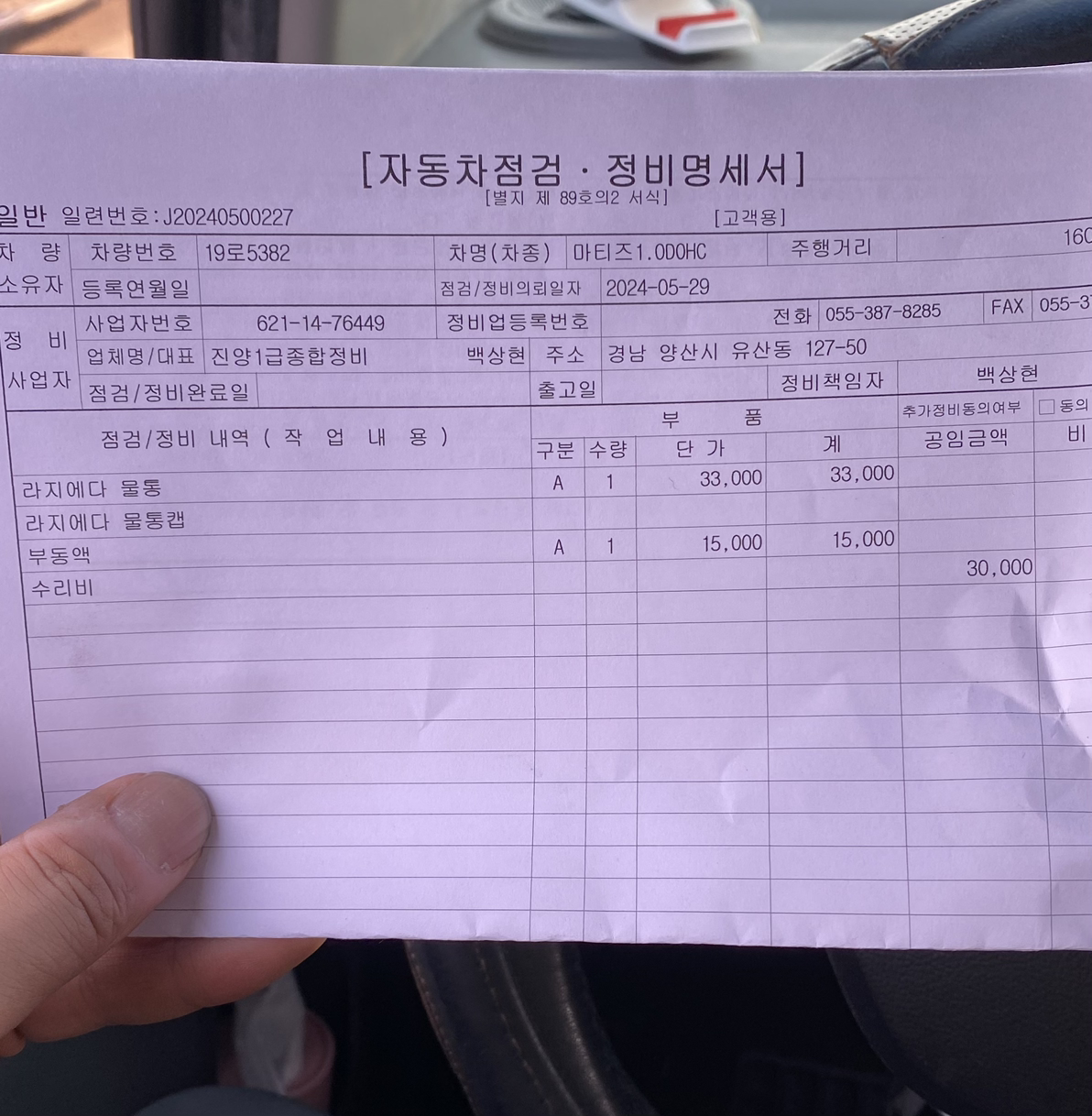 대우에서 스파크로 넘어갈 당시의 마티즈 마지막 모델이다 보니(2009년식 차에 16만을 탔다) 부품이 양산에 없어 부산에서 공수해와 교체를 해주셨다. 회사 동료 형님 소개로 알게된 단골 정비소인데, 바가지가 절대 없는 좋은 정비소이다. 엔진에 이상이 있을까봐 에어콘 가스를 보충해야 할까봐 비용이 많이 나올 줄 알았는데, 85,000원에 해결. 다행이다.