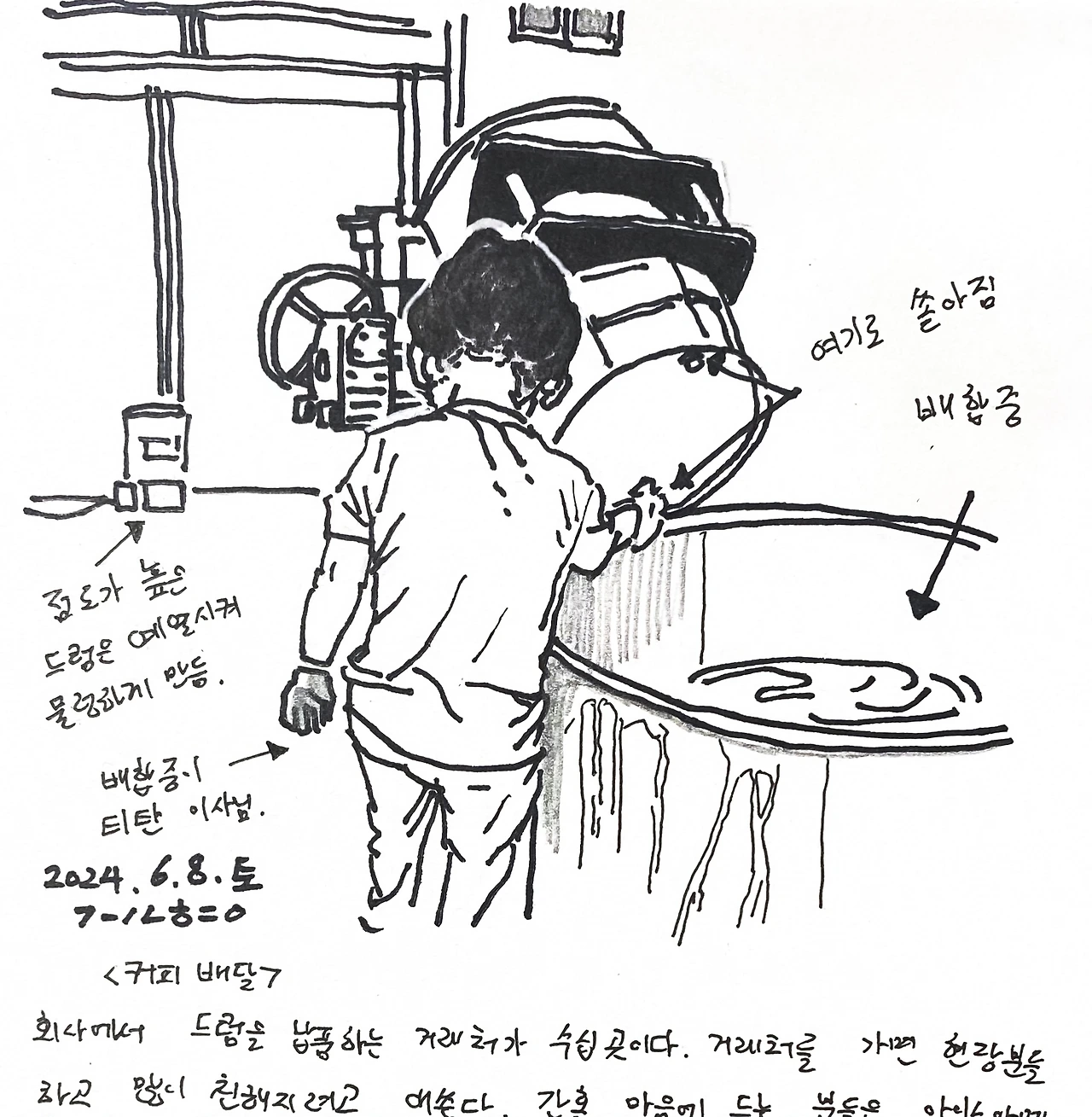 회사에서 드럼을 납품하는 거래처가 수십 곳이다. 거래처를 가면 현장 분들하고 많이 친해 지려고 애쓴다. 간혹 마음에 드는 분들은 아이스아메리카노를 내 돈으로 사서 커피 배달 한다. 현장 담당자가 마음에 들어서이기도 하고, 힘들게 일하고 있는데 누군가가 작은 걸 챙겨주면 고마워 한다는걸 내 경험으로 알기 때문이다. 그 사람의 마음을 얻어 놓으면 회사 일이 급할때 우리 편의를 봐주는 것도 이유중의 하나이다. 그림일기 주인공인 티탄 이사님은 혼자 일하시다가 아는 후배를 데리고 와서 둘이서 일하신다. 주말에 쉴 생각이라며 불금에 저녁 9시까지 일하신다고 했다. 드럼에 있는 내용물을 꺼꾸로 들어 배합중이신 모습.