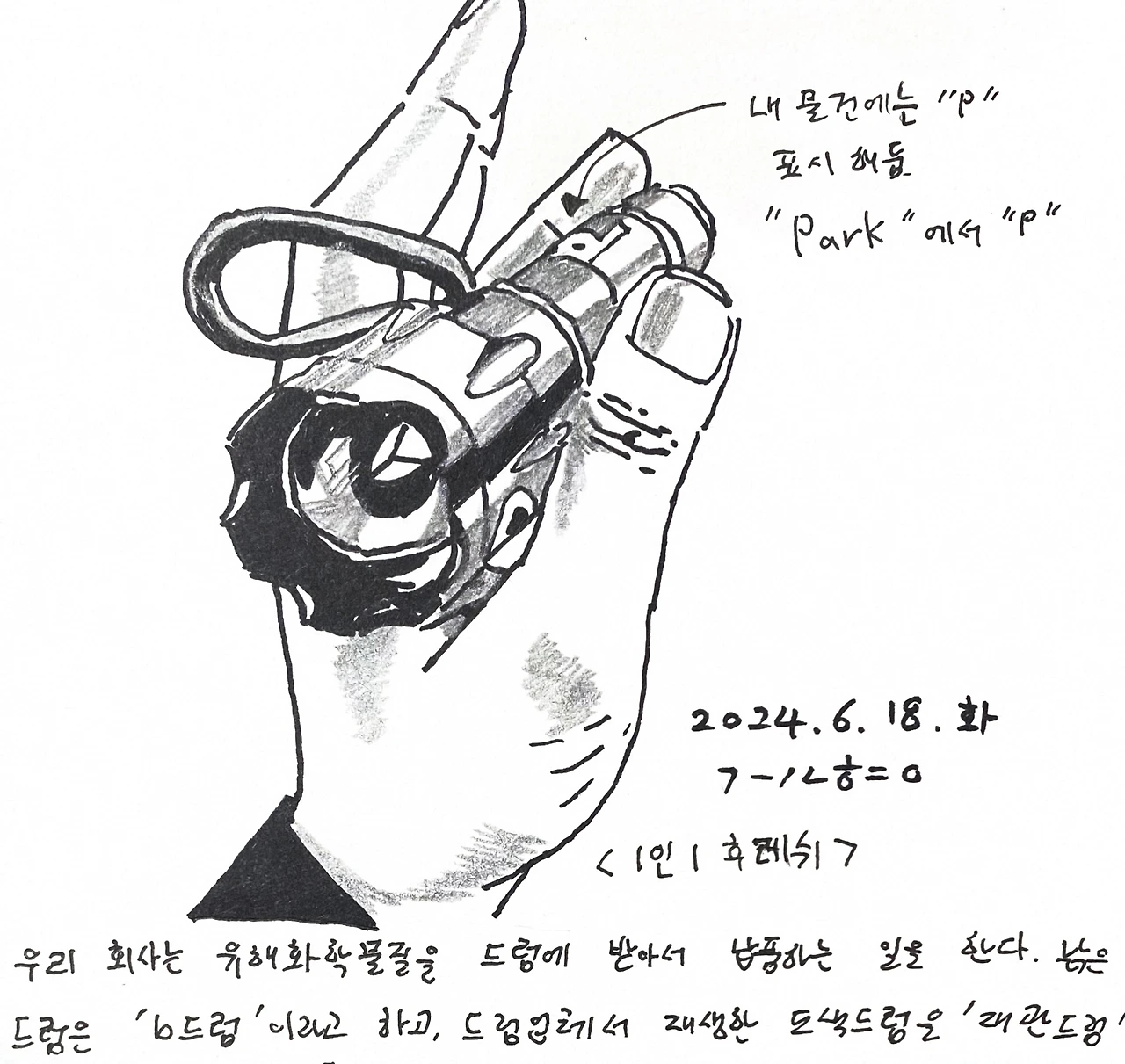 우리 회사는 유해화학물질을 드럼에 받아서 납품하는 일을 한다. 낡은 드럼은 ‘b드럼’이라고 하고, 드럼업체에서 재생한 도색드럼을 ‘재관드럼’ 이라고 한다. 새 드럼은 ‘신관드럼’. b드럼에 제품을 받을때는 항상 드럼 뚜껑을 열어 안에 녹이 슬거나 물이 없는지 확인을 한다. 제품에 물이 들어가면 그 업체 제조공정에 큰 문제가 생겨 보상을 해줘야 하는 일이 생기기 때문이다. 드럼 뚜껑을 열고 한쪽 눈을 감고 내부를 확인할때도 있지만, 후레쉬로 비춰서 볼때도 있다. 몇일전에 엄청나게 밝은 후레쉬를 회사에서 구매해 직원별로 하나씩 나눠주었다. 나는 작업복에 ‘P’를 표기 하듯이 후레쉬에도 하얀색 펜으로 ‘P’를 크게 적었다. 저번주 금요일에는 우리 회사 큰 거래처에 납품한 드럼중에 녹슨물이 나와서 사장님과 소장님, 김대리가 출동해 모든 드럼을 다 확인하고 몇 드럼을 회수해 왔다.