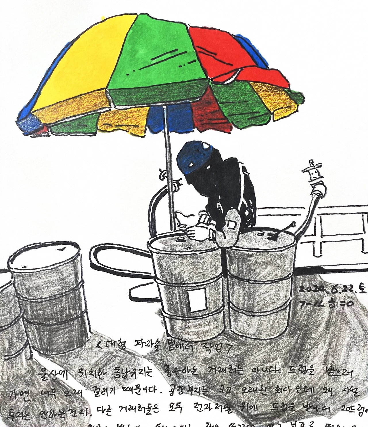 울산에 위치한 동남유지는 좋아하는 거래처는 아니다. 드럼을 받으러가면 너무 오래 걸리기 때문이다. 공장부지는 크고 오래된 회사인데 왜 시설 투자는 안하는건지. 다른 거래처들은 모두 전자저울위에 드럼을 받아서 20드럼에 30분 정도면 내용물을 받는다. 동남유지는 작은 뚜껑을 열고 부표를 띄워 그 부표가 잠길때까지 받기때문에 받는 속도가 느려 2시간이 넘는건 기본이다. 드럼을 받아주는 분이 젊길래 말을걸어 본다. 입사한지 40일정도 된 서른의 청년. 여기 들어오기전에는 건설업 쪽에서 인부들을 관리하며 일을 하다보니 힘든 부분이 많았는데, 동남유지는 반사무 반현장 일을 해서 맘이 편한다고 했다. 성격이 순하고 차분한 분이라 많은 대화를 나누었다. 땡볕에 1시간 40분이상 작업을 하면 죽음인데, 고참이 피서지에서나 볼수 있는 대형 파라솔을 가져와줬다. 고참 직원이 회사 야외 현장에 차양막을 설치해 달라고 요구하니 파라솔을 꺼내 쓰라고 했다고 한다. 그나마 그늘 아래에서 작업을 해 다행이었다.