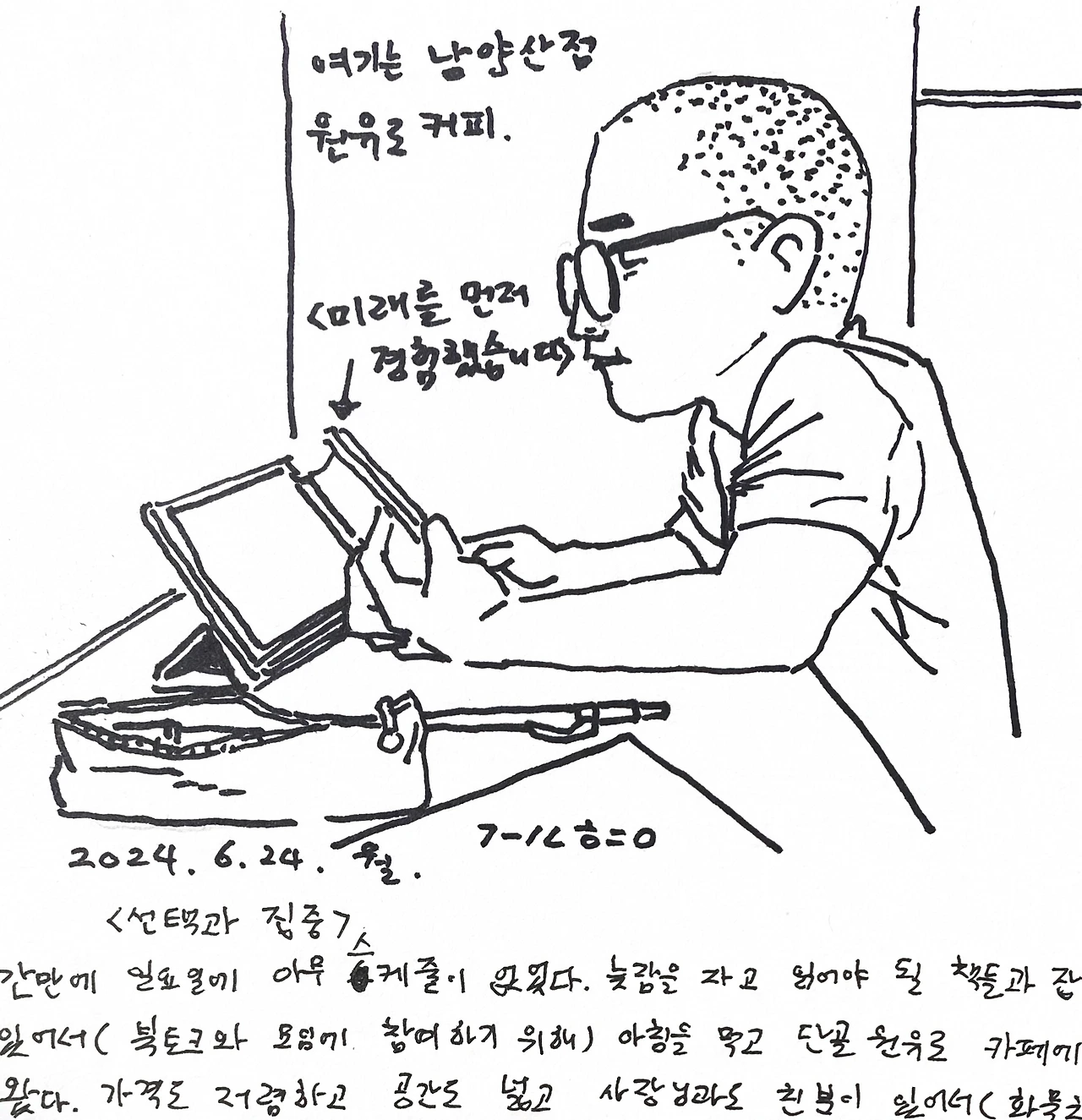 간만에 일요일에 아무 스케줄이 없었다. 늦잠을 자고 읽어야 될 책들과 잡지가 있어서(북토크와 모임에 참여하기 위해) 아침을 먹고 단골 원유로 카페에 왔다. 가격도 저렴하고 공간도 넓고 사장님과도 친분이 있어서(화물차 몰고 지나가면서 거의 하루에 한번꼴로 들리는 곳) 오래 머물러도 되는 곳이다. 여기서는 할게 없기 때문에 책을 읽거나 그림을 그리거나 글을 쓰려는 목적으로 오게 된다. 친한 가게에 가면 주인장과 수다로 시간을 많이 보내게 된다. 두 권의 책을 읽고 리뷰를 쓰고 그림일기도 그렸다. 점심으로 핫도그와 새 음료를 주문해 먹었다. 음료 가격이 싼데 음료 하나 시켜놓고 오래 있으면 죄송하니깐. 그리고 근처에 있는 헬스장에 운동을 갔다. 하반기에는 선택과 집중의 시간을 보내려고 한다. 운동하고 내 시간을 가지며 책읽고 그림그리고, 드로잉 수업을 하고. 모든 것을 다 할수는 없고, 몇개를 하지 않기로 마음먹고 집중해서 하는것이 내게 필요한 타이밍이다. 휴식과의 적절한 조율이 중요하다는 걸 이제 안다.