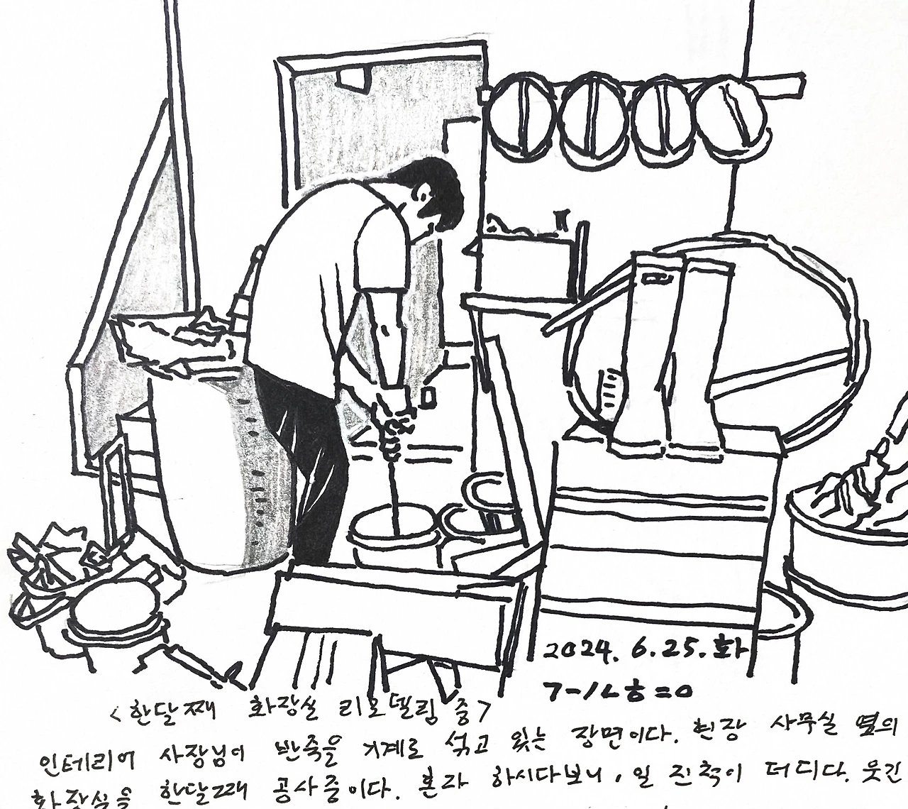인테리어 사장님이 반죽을 기계로 섞고 있는 장면이다. 현장 사무실 옆의 화장실을 한달째 공사중이다. 혼자 하시다보니, 일 진척이 더디다. 웃긴건, 아이 세명의 엄마이신 중년의 직원이 있을땐 화장실을 손볼 생각을 하지도 않더니, 이십대 중반 여성이 경리 직원으로 오니 혹시나 회사 그만둘까봐 화장실 공사를 했다는 것. 새로오신 주임님은 남양산쪽의 사무실에서 일을 익히고 있는 중이고, 화장실 공사에 이어 사무실공사까지 끝나면 우리 사무실로 출근해야 한다. 현장에서 소장님이 혼자서 일하기엔 많이 벅차기 때문이다. 사장님이 정말 지저분했던 화장실을 하나하나 손보며 바꿔가는 과정이 참 신기했다. 어떻게 그 모든걸 다 할 수 있는 거지? 전문가는 전문가다. 사장님은 샤이한 분이라 점심 같이 먹자고 해도 어색할까봐 혼자 밖에서 식사를 하신다. 사장님 포토 트럭은 시동을 걸면 엄청 시끄러워서 주변의 모든 사람의 시선을 집중시키는데, 농담삼아 차 퍼지겠다고 했다. 한달동안 자주 보니 사장님하고도 정이 들었다. 화장실이 수리중이니 볼일은 늘 거래처에 가서 보는게 좀 불편하긴 하다.