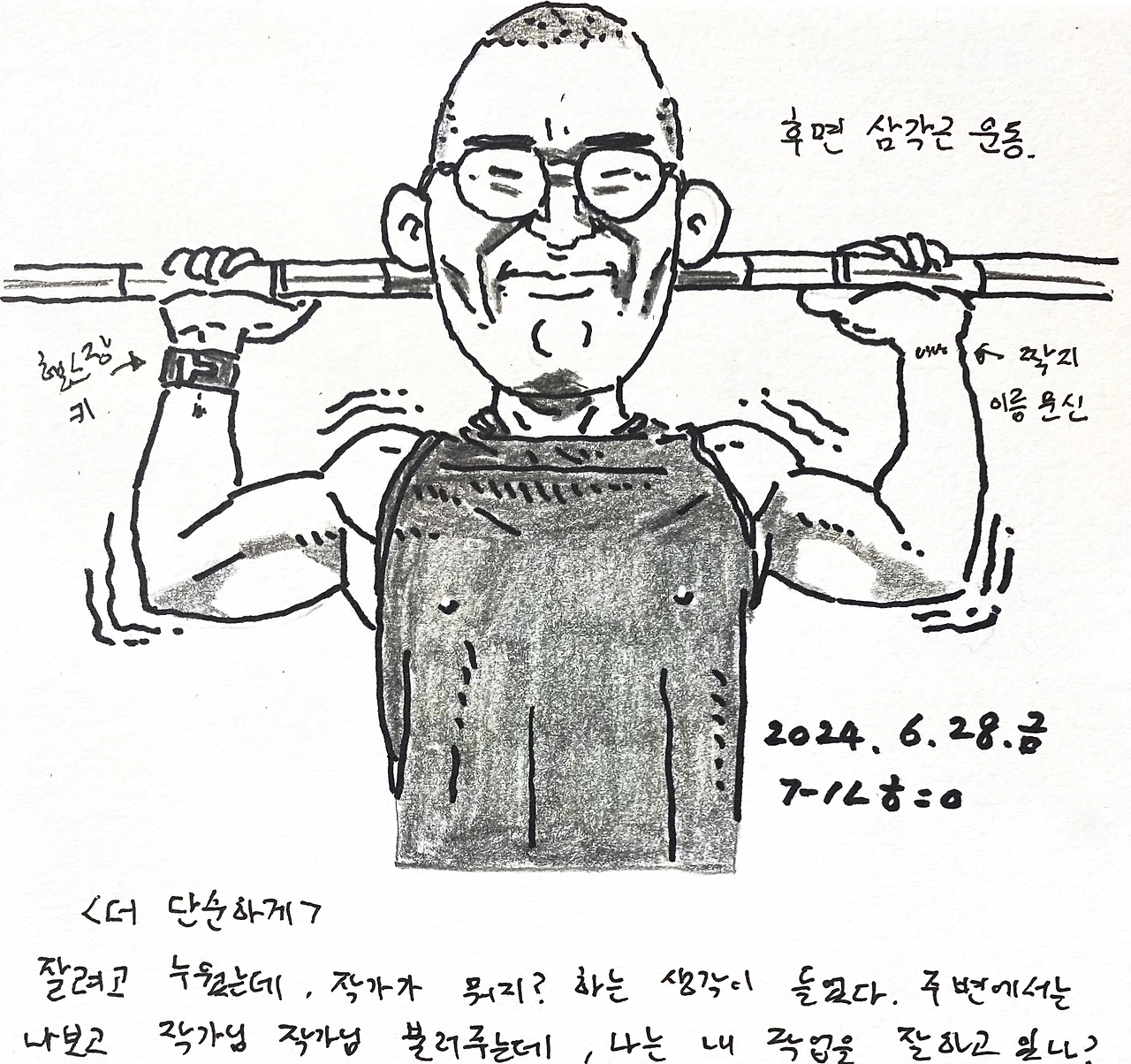 잘려고 누웠는데, 작가가 뭐지 ? 하는 생각이 들었다. 주변에서는 나보고 작가님 작가님 불러주는데, 나는 내 작업을 잘하고 있나? 하는 생각이 들었다. 얼마전에 ‘선택과 집중’ 이라는 그림일기를 그렸는데, 더 단순해져야겠다고 마음 먹었다. 인스타에서 꾸준하게 자기 방식의 작업을 하는 많은 작가님들을 보면서 난 뭘하고 있지? 하는 의문이 들었기 때문이다. 경주책방에서 5주간 듣기로 한 원전 강의도 양해를 구하고 취소하고, 3개월간 진행되는 아이폰으로 영화 찍기 무료 수업도 취소를 했다. 그림도 주로 A5 종이에 작은 인물그림만 그렸는데, A4에서 8절까지 큰 그림 작업도 살살 해보고, 수채화 채색도 수업듣는거 더이상 그만 듣고 내 그림을 그려야겠다는 생각을 했다. 운동하고, 그림그리고, 책읽고, 드로잉 수업하고 그렇게 단순하게 내 삶을 구성해야겠다.
