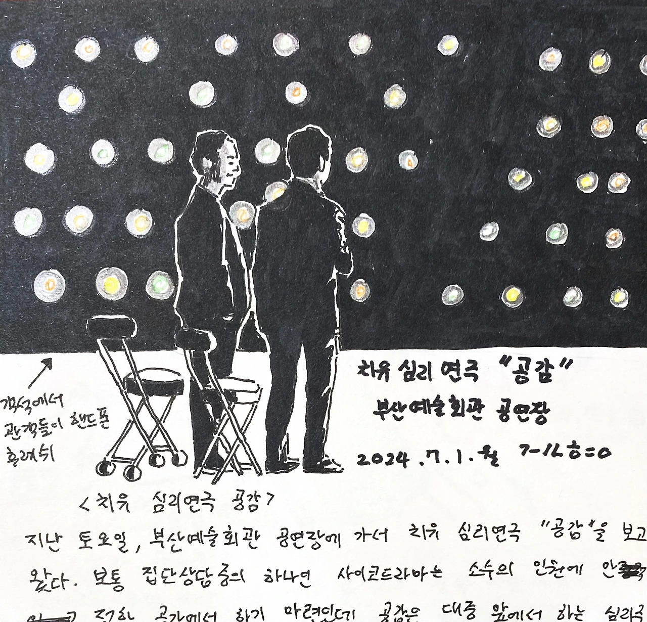 지난 토요일, 부산예술회관 공연장에 가서 치유 심리연극 “공감”을 보고왔다. 보통 집단상담중의 하나인 사이코드라마는 소수의 인원에 안전한 공간에서 하기 마련인데 공감은 대중앞에서 하는 심리극 치유 드라마였다. 자기 문제를 가진 네명의 관객이 무대위에 올라왔고 한분이 무대의 주인공이 되어 심리극이 진행되었다. 그냥 있으면 심심하니 아버지 역할로 자원해서 무대에 올라갔다. 조명때문에 무대에 서면 객석이 보이지 않는다. 맨 마지막에 드라마가 끝나면 관객들이 핸드폰의 후레쉬를 켜서 음악에 맞춰 좌우로 흔드는데, 공감의 마지막 레파토리인 모양이었다. 무대의 주인공 또한 많은 사람들의 지지와 응원을 받는 느낌이지 않을까. 그림은 검색해서 발견한 마지막 장면의 이미지를 보고 그린 것이다. 주인공은 양산에 사는 분이었는데, 심리극을 한번 진행한다고 자신의 문제가 깔끔하게 해결되는게 아니니 이제부터 또 새로운 시작이라고 생각하고 자신의 심리 문제를 앞으로도 꾸준히 잘 들여다 보시길 진심으로 응원해 본다.