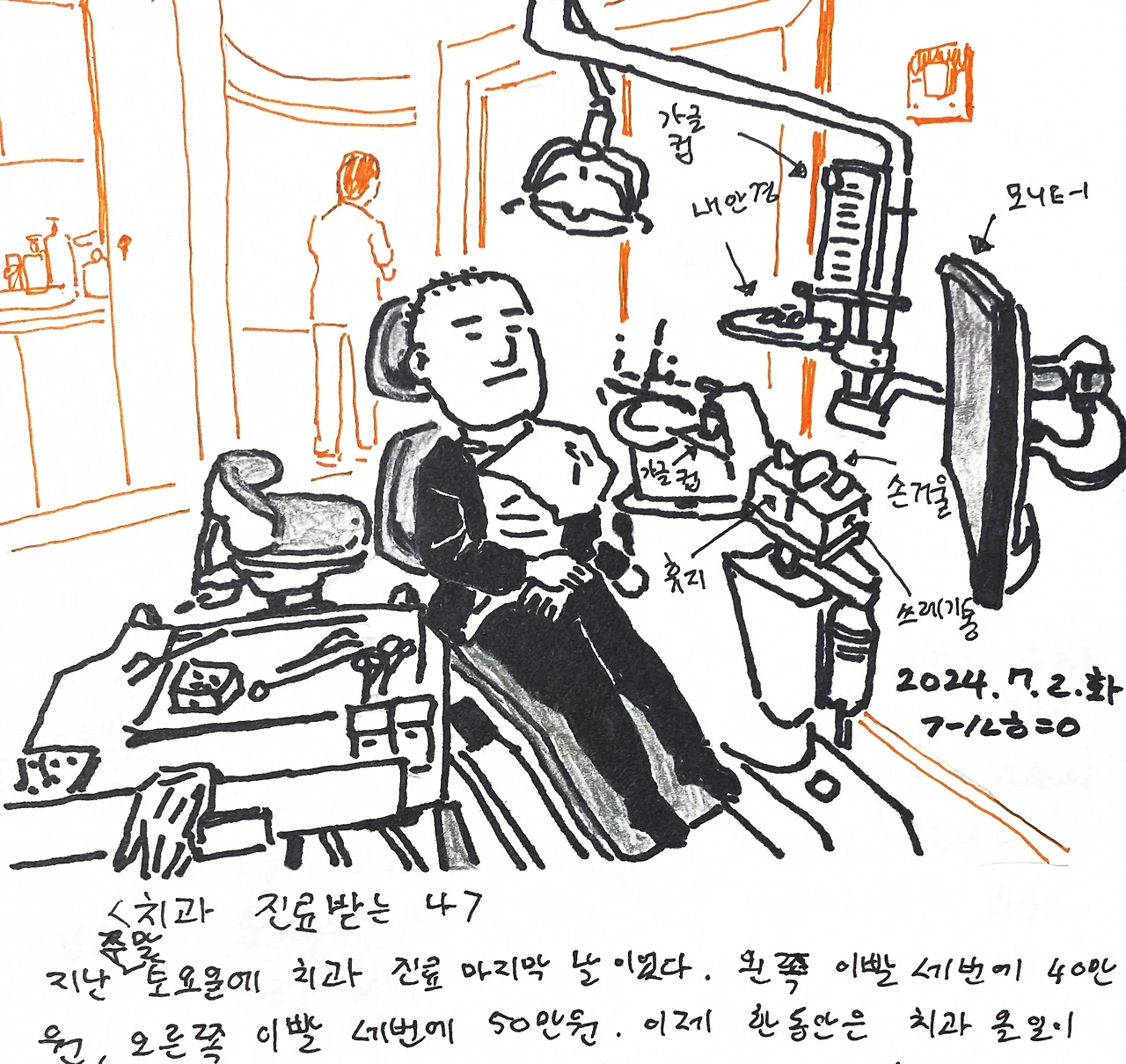 지난 주말 토요일에 치과 진료 마지막날이었다. 왼쪽 이빨 세번에 40만원, 오른쪽 이빨 세번에 50만원. 이제 한동안은 치과 올 일이 없어서 간호사 선생님께 내가 진료대에 누워있는 모습을 광각으로(0.5배로) 찍어 달라 부탁드렸다. 그림일기를 그리는데 치과 풍경을 그리고 싶어서 그런다고 설명을 드리고 내 인스타의 그림일기들을 보여드리니 혼쾌히 찍어주셨다. 나중에는 작게 ‘그림일기 잘 그리세요~’ 라고 말씀해 주셨다. 늘 어디를 가나 그림일기 소재다 싶으면 적극적으로 그 장면을 찍으려고 한다.(찍은 걸 보고 간단하게 그리는게 수월하다) 상대방에게 양해를 구하거나 부탁을 하면 대부분 괜찮다고 하신다.