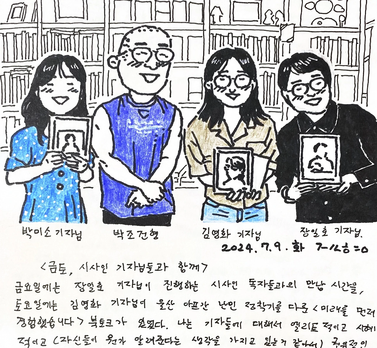 금요일에는 장일호 기자님이 진행하는 시사인 독자들과의 만남 시간을, 토요일에는 김영화 기자님이 울산 아프간 난민 정착기를 다룬 <미래를 먼저 경험했습니다> 북토크가 있었다. 나는 기자들에 대해서 엘리트적이고 시혜적이고(자신들이 뭔가 알려준다는 생각을 가지고 있는 거 같아서) 권위적인 사람들이라는 편견이 있는 편이다. 장일호 기자님의 <슬픔의 방문>을 읽고 그 편견이 조금 깨어졌었고, 시사인 읽기 모임을 통해 시사인이 나름 평등한 의사결정구조를 가진 집단이라는 이해를 하게 되어, 고민하다가 1년간 시사인 잡지를 정기구독 하고 시사인 읽기 모임에도 지역에서 함께 참여해보려고 생각했다. 박미소 사진기자님은 이틀 모두 오셔서 멋진 사진을 찍어주셨다.부모님이 울산 분이라 울산의 딸이라고 농담삼아 호명해 드렸다. 세분에 대한 호감이 있어서 정성껏 그림을 그리고 액자에 넣어 선물로 드렸다. 이런 멋진 자리를 자주 만들어 주시는 자크르 대표님에게 무한의 애정을 보낸다.
