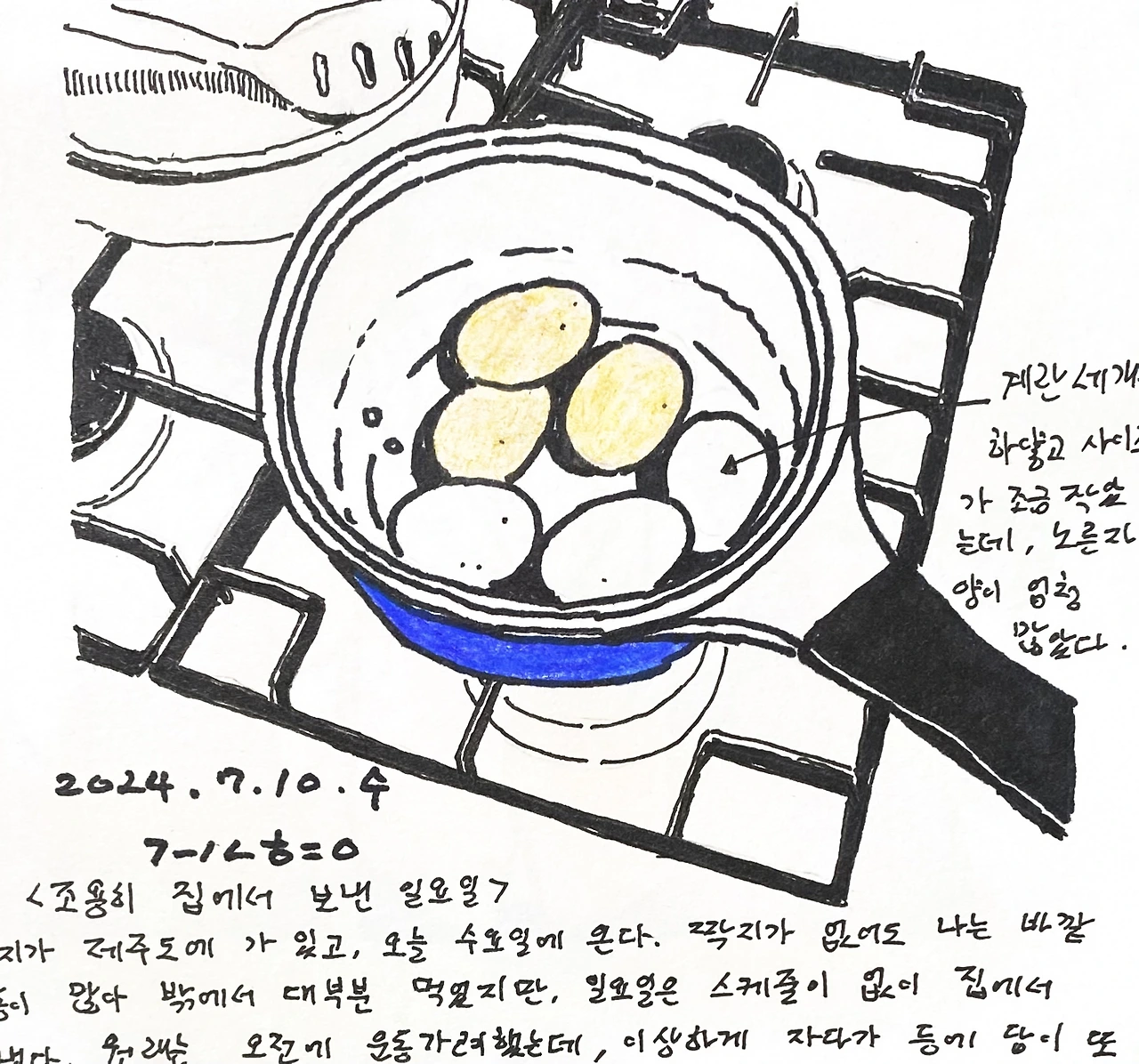 짝지가 제주도에 가 있고, 오늘 수요일에 온다. 짝지가 없어도 나는 바깥 활동이 많아 밖에서 대부분 먹었지만, 일요일은 스케줄이 없이 집에서 보냈다. 원래는 오전에 운동하러 가려했는데, 이상하게 자다가 등에 담이 또 왔는지 등이 불편해서 잠을 깊이 못잤고, 운동은 패스하기로 하고 늦잠을 잤다. 일어나 그림을 그리다가 배가 고파서 점심을 먹었다. 일단 냉장식품인 갈비탕을 데워 밥을 말아 김치랑 먹었다. 햇반 1인분은 배가 덜 찰때가 많아 1.5인분 햇반도 나왔으면 하는 바람이다. 팔도비밈면에 계란 삶아 먹으려고 냉장고에서 계란을 꺼냈다. 회사에서 어디서 난간지 달걀한판을 가져와 5등분해서 가져가라해서 가져온 계란이었다. 계란 삶기 검색하니 물 끓고 나서 9분 타이머를 재라고 했다. 잘 까지기 위해서 식초와 소금을 넣고 다 익으면 바로 찬물로 식히라 했다. 음식들은 검색하면 해 먹는 방법이 다 나와서 나중에 그런식으로 요리를 해 먹어도 될거 같다. 팔도 비밈면에 삶은 계란 세개 넣어 먹었다. 다시 그림을 집중해서 완성하고 나니 기가 빠져서 낮잠을 한 숨 잤다. 일어나 그림을 또 그리다가 아까 낮에 먹었던 갈비탕을 마저 데워 먹고 키위 두개를 까 먹었다.