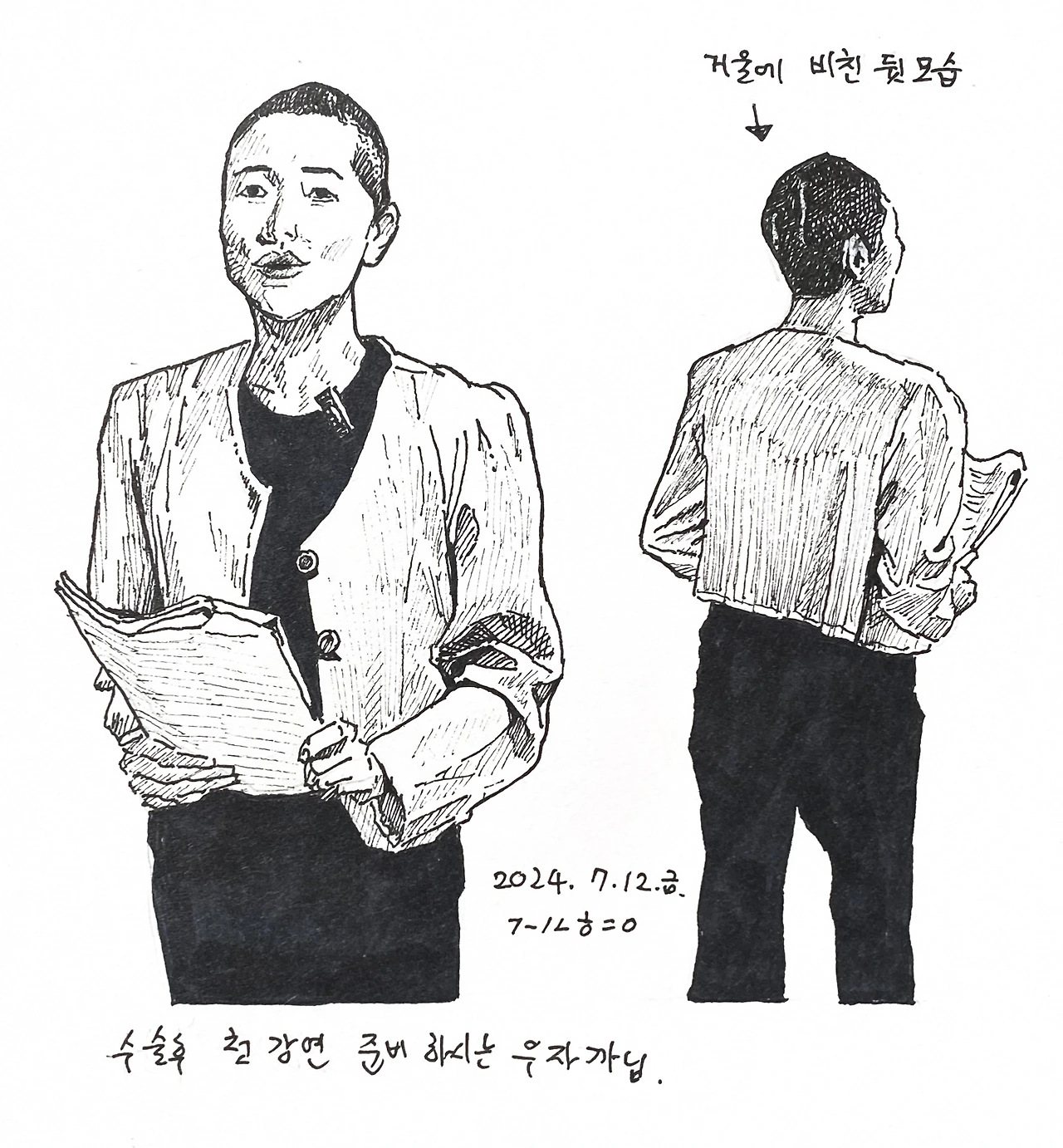 사고 전에는 강연도 많이 하시고, 웹툰도 연재하고 다재다능한 분이셨다. 그림은 수술이후 첫 강연을 준비중인 우자까 님의 모습이다. 언어 재활중이시기 때문에 아는 단어들이 떠올리지 않는 경우가 종종 있다고 하셔서 대본을 준비해 대본 없이도 강연을 할 수 있도록 준비중이시다. 시니어 모델들을 대상으로 한 강연인데, 인생2막인 시니어들에게 우자까님의 이야기가 많은 울림을 주지 않을까 싶다. 사고 전에 두번째 책 작업중이었다고 하시던데…….천천히 재활 잘 하셔서 컨디션이 괜찮아 지시면 두번째 책 작업도 잘 하시실 응원해 본다.