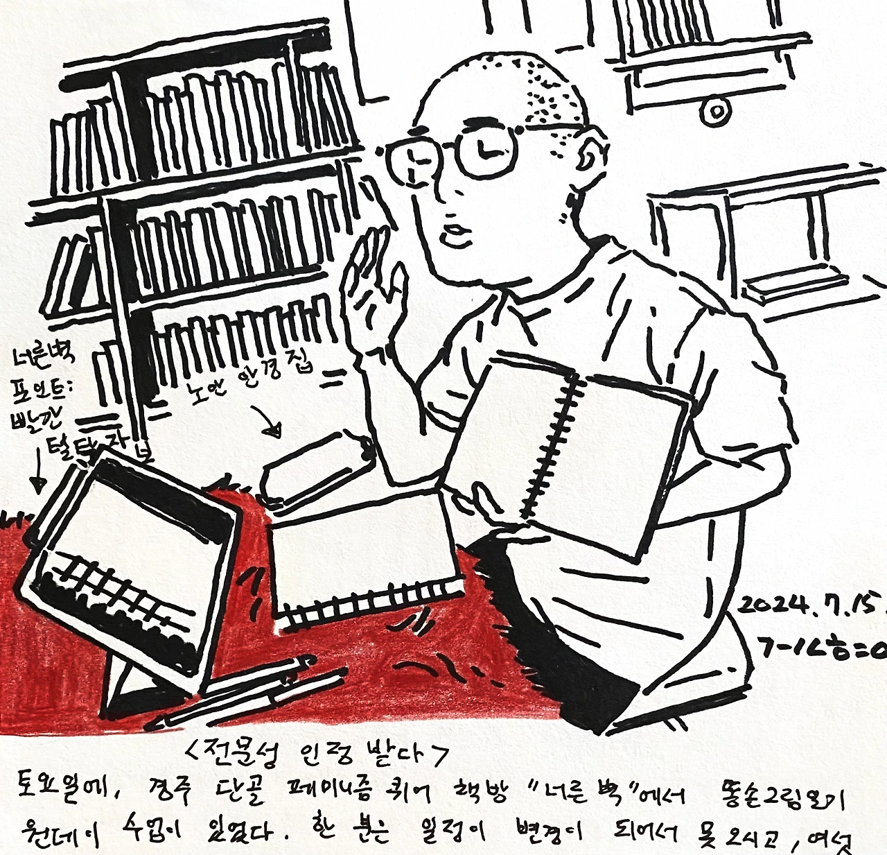 토요일에, 경주 단골 페미니즘 퀴어 책방 “너른벽”에서 똥손그림일기 원데이 수업이 있었다. 한 분은 일정이 변경이 되어서 못 오시고, 여섯 분이 수업을 함께 해 주셨다. 늘 사석에서 만나기만 했던 사장님과 일로 처음 의뢰받고 원데이수업을 해 드린 셈이다. 나를 늘 말이 많고 웃기기만 한 남성 페미니스트라고 생각하셨던 사장님이, 오늘 수업을 다 들어보더니 전문성이 있네, 수업 잘 하네, 하며 나의 직업적 전문성을 인정해주셨다. 뿌듯!! 똥손그림일기 원데이수업은 너른벽이 여덟번째 수업이다. 똥손들도 흥미를 가질수 있도록 원리와 이론을 충분히 설명해 드리고 시연도 해드리고, 각자가 막히는 부분들을 시원시원하게 대답해 드리니 참여자분들 모두 재미있게 그림일기를 그리셨다. 똥손그림일기 원데이 클래스 관심있는 분들은 수업 의뢰해 주세요. 언제든 환영합니다.
