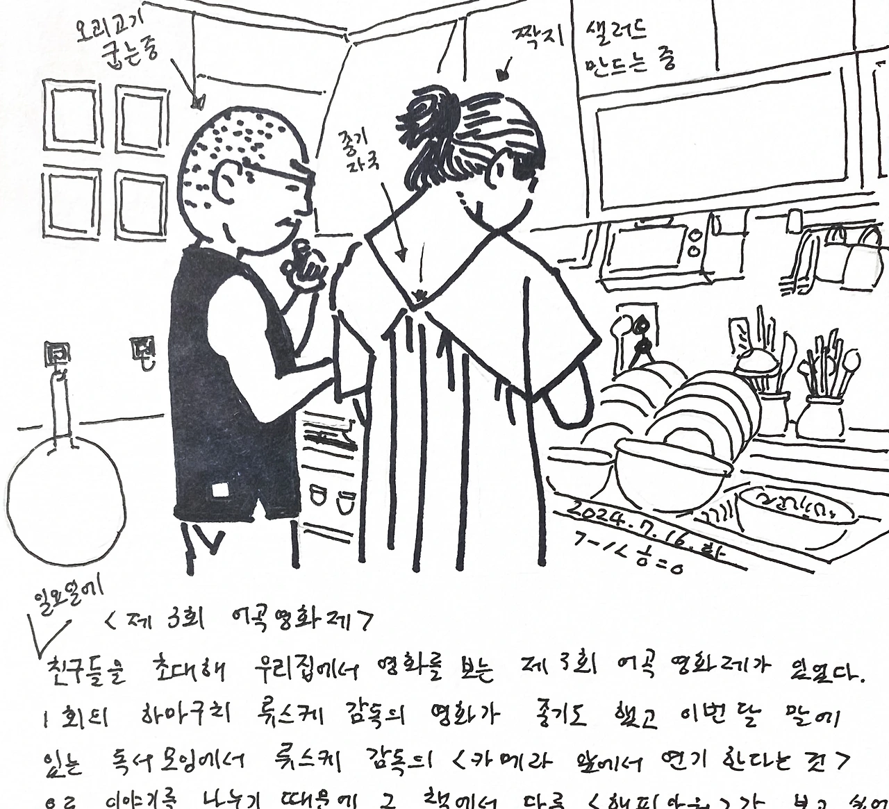 일요일에 친구들을 초대해 우리집에서 영화를 보는 제3회 어곡영화제가 있었다. 1회의 하마구치 류스케 감독의 영화가 좋기도 했고 이번달 말에 있는 독서모임에서 류스케 감독의 <카메라 앞에서 연기 한다는 것>으로 이야기를 나누기 때문에 그 책에서 다룬 <해피아워>가 보고 싶었다. 러닝타임은 5시간 20분. 설혜씨와 소연쌤이 와주셨다. 설혜씨는 오리고기와 채소를 챙겨와 주셨고, 소연쌤은 예전에 이 영화를 한번 보신적이 있는데, 우리집에 처음이라 놀러 오셨다. 그림은 나는 오리고기를 굽고, 짝지가 메밀비빔면을 만들고 있는 장면이다. 밥과 디저트까지 든든히 먹고, 커피를 하나씩 챙겨 영화를 보기 시작했다. 집에서 친구들과 보면 좋은 점은 인터미션도 마음대로 정할 수 있고, 영화중에 마음에 드는 장면은 다시 돌려 핸드폰으로 사진을 찍을 수 있고, 영화 내용에 대해 계속 수다를 떨 수 있다는 점이다. 우리 일상속에서 있을 법한 소재들이라 이야기가 끊이지 않았다. 참고로 우리부부는 영화를 좋아해 티비가 75인치이다.