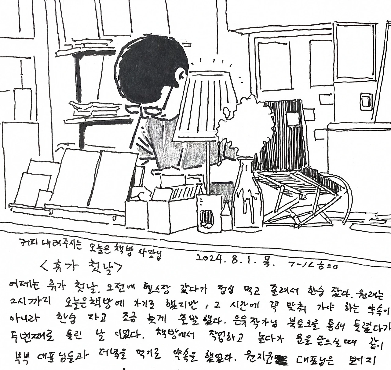 어제는 휴가 첫날. 오전에 헬스장 갔다가 점심 먹고 졸려서 한숨 잤다. 원래는 2시까지 오늘은책방에 가기로 했지만, 그 시간에 꼭 맞춰 가야 하는 약속이 아니라 한숨 자고 조금 늦게 출발했다. 은유작가님 북토크를 통해 들렸다가 두번째로 들린 날 이었다. 책방에서 작업하고 놀다가 문을 닫으실때 같이 부부 대표님들과 저녁을 먹기로 약속을 했었다. 원지윤 대표님은 보이지 않았는데, 시간이 흘러 남편분(아직 성함도 모른다 ^^;;)이 조심히 오시더니 아내와 아이가 더위를 먹고 몸살이 나서 식사 약속을 다음으로 미뤄야 하겠다고 하셨다. 그런 취소는 언제든지 괜찮다고 말씀드리고 근처 갈만한 식당을 물었다. 두 곳을 추천해 주셨는데, 메밀촌옹심이마을에 가서 들기름막국수를 곱배기로 먹었다. 사장님도 자주 먹는 메뉴라 하셨는데, 정말 맛있었다. 책방에 평일날인데 20대로 보이는 두 손님이 오셔서 한참을 책을 읽고 있었다. 한 분은 취업준비생, 한 분은 경주 토박이인데 울산에서 직장을 다니다가 휴가삼아 경주에 놀러오셨다 했다. 내 그림일기를 보여드리면 관심있게 보실거 같아 말을 걸고 두번째 노트를 보여드렸다. 두 분 중 한 분이 예전에 그림그리기를 좋아했다며 그림일기라는 방식에 관심을 보이셔서 한참 설명을 드렸다.