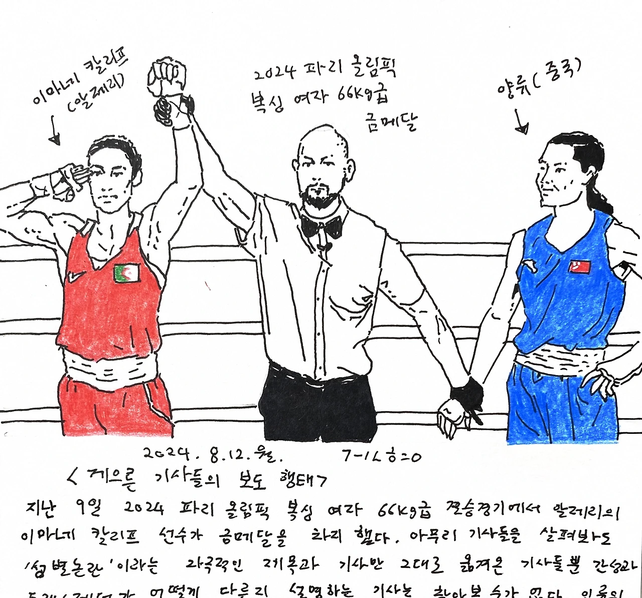 지난 9일 2024 파리 올림픽 복싱 여자 66KG급 결승경기에서 알제리의 이마네 칼리프 선수가 금메달을 차지 했다. 아무리 기사들을 살펴봐도 ‘성별논란‘이라는 자극적인 제목과 기사만 그대로 옮겨온 기사들뿐 간성과 트랜스젠더가 어떻게 다른지 설명하는 기사는 찾아볼수가 없다. 인류의 1.7%가 간성으로 태어난다고 하는데 간성이란 한 몸에 여성과 남성의 특성이 함께 존재하는 사람들을 말한다. 대부분 간성으로 태어난 사람들은 어린시절 부모에 의해 한쪽의 성으로 지정하여 계속 살아가는 편이다. 그래서, 자신이 간성인줄 모르고 살다가 어른이 되어 우연히 자신이 간성인줄 아는 사람도 있다. 그러니, 이마네 칼리프 선수는 트랜스젠더도 아니고 간성인 사람인 것이다. 이마네 칼리프는 여성으로 살아왔으며 여성경기에 지장을 줄 정도로 남성적인 특징이 있는 것이 아니다. 어느 기사에도 이런 간성인의 특성에 대해 설명을 해주는 기자는 없다. 모르면 쉽게 혐오하게 되는 법인데, 제대로 된 설명을 해주려고 공부하는 기자들은 없고 논란만 확산시키는 꼴이라니, 무식한 기자들은 자신들의 무식함과 게으름에 부끄러움을 느꼈으면 한다.