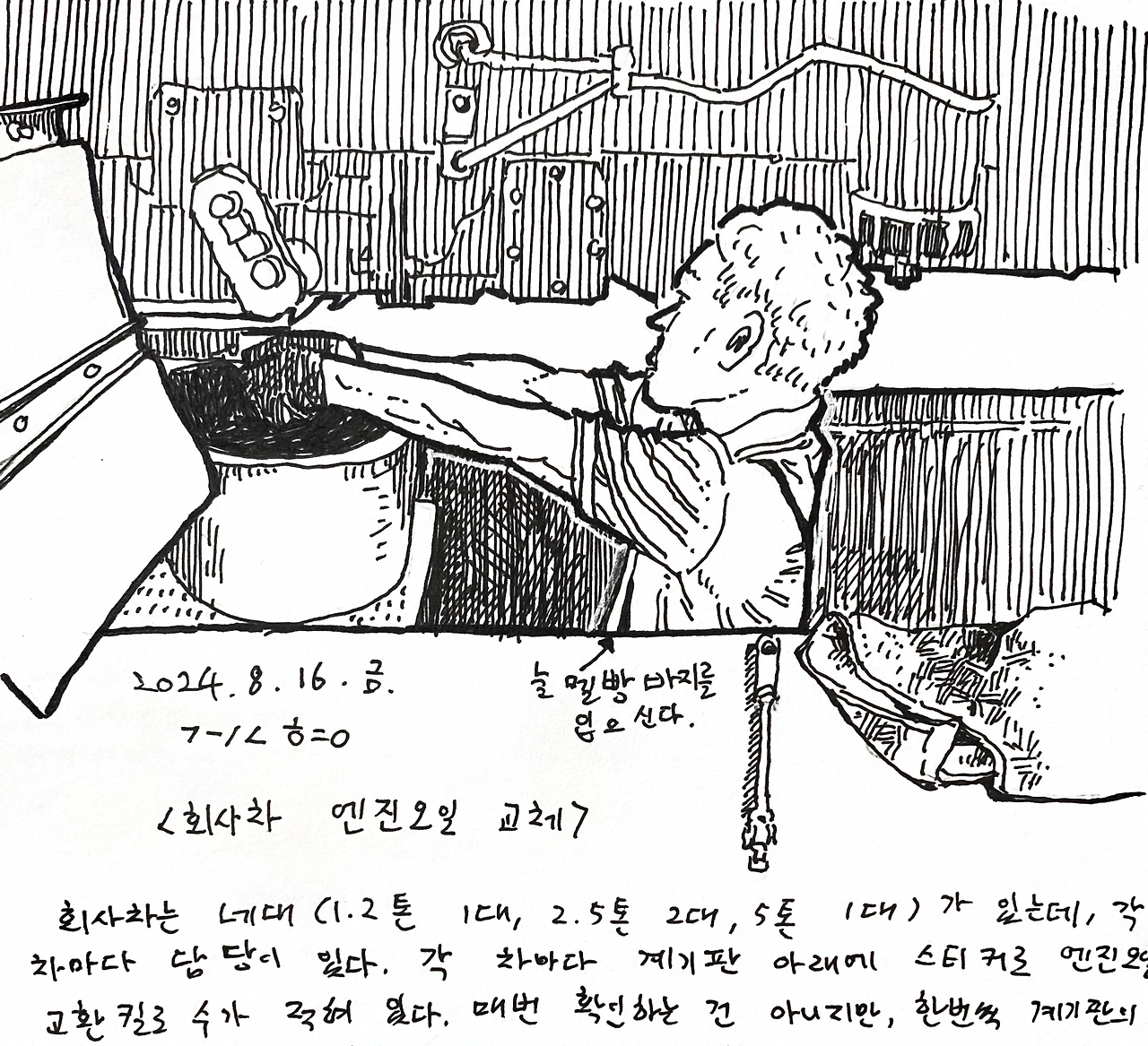 회사차는 네대(1.2톤 1대, 2.5톤 두대, 5톤 1대)가 있는데, 각차마다 담당이 있다. 각 차마다 계기판 아래에 스티커로 엔진오일 교환킬로 수가 적혀 있다. 매번 확인하는건 아니지만, 한번씩 계기판의 킬로 수와 스티커 숫자를 비교해서 갈때를 확인한다. 김대리는 자기 관리해야하는 차를 제때 엔진오일을 갈지 않아서 엔진이 눌러 붙어 몇백만원이 깨진 적이 있다. 엔진오일을 갈러가는 정비소가 있다. 아침에는 아주 조금 시원해 졌지만, 낮에는 더워서 사장님 아아 까지 두잔 테이크아웃 해서 커피를 들고 정비소에 갔다. 더워서 사왔다며 사장님을 드리고, 엔진오일 교체해 주시고 라이닝 봐주시고 타이어 공기압 체크까지 해달라고 하고 나는 시원한 사무실로 들어갔다. 사무실TV에는 범죄예능 프로가 나오고 있었다. 엔진오일은 금방 갈았고 회사카드로 결제했다. 거래처에 갈때 가끔 음료수나 시원한 커피를 사갈때가 있는데, 이번에는 반응이 영 시원찮다. 커피를 원래 잘 안드셔서 그런 걸 수도 있고 정비소 사무실 에어콘이 시원해서 목이 별로 안 말라 손을 안대신 걸수도 있다. 나의 호의가 늘 환대받는 건 아니지만, 나의 사회생활 생존술이다.