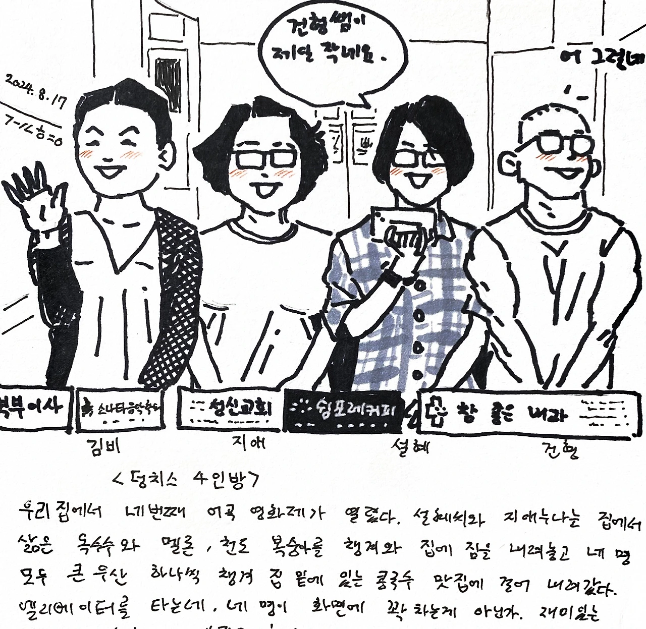 우리집에서 네번째 어곡 영화제가 열렸다. 설혜씨와 지애누나는 집에서 삶은 옥수수와 멜론, 천도복숭아를 챙겨와 집에 짐을 내려놓고 네명 모두 큰 우산 하나씩 챙겨 집 밑에 있는 콩국수 맛집에 걸어 내려갔다. 엘리베이터를 타는데, 네명이 화면에 꽉차는게 아닌가. 재미있는 그림이라 설혜씨가 사진을 한장 찍고 내 키가 네명중에서 제일 작은줄 처음 알았다. 고고윤산 친구들중에 이렇게 네명이 덩치와 키가 있어서 내가 ‘덩치스’라고 이름지었다. 다들 어디가면 여자치고 큰 키라 신경도 쓰이는데, 덩치스 중에 있으면 자신이 그렇게 커보이지 않아 많이 편하다는 설혜씨와 지애누나. 다들 콩국수 맛집 인정해 주셨고, 집으로 올라와 영화를 봤다. 호불호가 있는 영화라 중간에 조는 분이 있어 영화를 잠시 정지해놓고 삶아온 옥수를 먹었다. 그리고, 냉동딸기를 녹혀 우유랑 믹스한 딸기우유도 하나씩 대접. 비싼 멜론인지라 1인 1접시 멜론도 먹었다. 작년처럼 9월에 바다에 놀러가기로 날짜도 정했다. 내가 사랑하는 덩치스 멤버들.