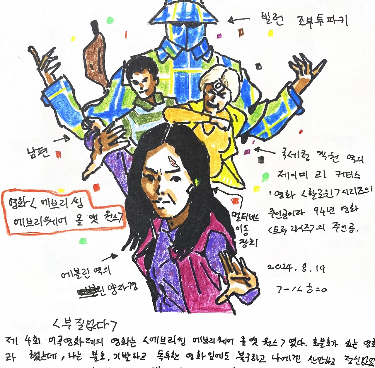 제 4회 어곡영화제의 영화는 <에브리씽 에브리웨어 올 앳 원스> 였다. 호불호가 있는 영화라 했는데, 나는 불호. 기발하고 독특한 영화임에도 불구하고 나에겐 산만하고 정신없었던 영화였다. 내가 꽂힌건, 에블린(양자경)의 딸이자 빌런인 조부 투파키 가 말하던 세상의 부질없음 이었다. 29년동안 우울증을 겪으며 내가 늘 느꼈던 생각이 부질없음이었다. 어차피 내 우울증은 괜찮아지지 않을 것이고, 우울증이 심해질때마다 죽고 싶었고, 세상은 결국 멸망할 거고, 뭔가 열심히 하는게 대체 무슨 소용이고, 결국 다 죽을건데 부질없다는 생각이었다. 딸 조이가 이민자의 딸이자 레즈비언 정체성으로 살아가며 겪는 혼란, 엄마에게 이해 받지도 못하고 엄마는 일하느라 늘 바쁘고. 빌런 조부 투파키는 세상이 부질없다고 느끼기에 베이글 블랙홀로 세상을 다 빨아들이고, 자신도 사라지려 한다.(영화속에서 돌이된 조부 투파키는 절벽으로 떨어지려 한다) 기발한 상상력으로 영화를 정신없게 만들더니 결국 가족으로 봉합하는 마무리도 별로. 세상에 대해 부정적이고 지칠대로 지친 딸이 엄마의 솔직한 마음과 사랑을 고백받는다고 해서 바로 가족의 품으로 돌아간다고? 글쎄다. 어떤 가족에겐 거리감이 필요할수도 있고, 거리감이 필요한 시기도 있는데, 무조건 가족으로 봉합하려는 그 결말이 너무 안이하게 느껴졌다.