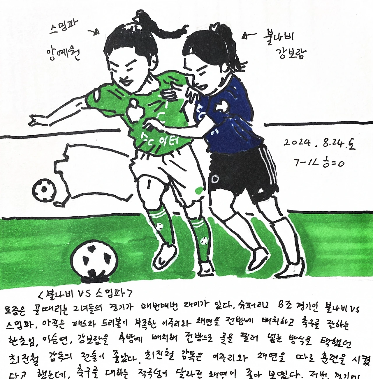 요즘은 골때리는 그녀들의 경기가 매번매번 재미가 있다. 슈퍼리그 B조 경기인 불나비VS스밍파. 아직은 패스와 드리볼이 부족한 이주리와 채연을 전방에 배치하고 축구를 잘하는 한초임, 이승연, 강보람을 후방에 배치해 전방으로 골을 찔러 넣는 방식을 택했한 최진철 감독의 전술이 좋았다. 최진철 감독은 이주리와 채연을 따로 훈련을 시켰다고 했는데, 축구를 대하는 적극성이 달라진 채연이 좋아 보였다. 저번 경기에 이어 이번경기까지 채연의 연속 득점. 불나비가 첫골을 넣고 스밍파가 따라가고 불나비가 또 넣고 스밍파가 따라가다가 심으뜸이 역전골. 심으뜸의 빠른 스피드와 체력이 놀랍고 골을 몰고 가다가 그 위치에서 때려넣는 모습이 프로선수 같았다. 두 팀 모두 모든 것을 쏟아 붓는 태도가 대단했고, 있는 힘을 다 쏟아부었는데도 져서 흘리는 강보람의 눈물이 어떤건지 충분히 상상이 되었다. 화도 날거 같았다. 앙예원은 늘 열심히는 뛰어다녀도 골 결정력이 없었는데, 골대 맞고 튀어나온 볼에 면상이 맞아 골이 들어갔다. 같은 팀원들도 본인도 티비를 보는 짝지와 나도 정말 크게 웃었다. 지고 있는 불나비 팀원들에게 버텨야돼, 이건 너희들이 버텨야 한다고 말하는 최진철 감독의 말과, 박주호 감독이 선수들에게 남은 3분을 쏟아 부어야 후회가 없다고 한 말이 인상에 남는다.