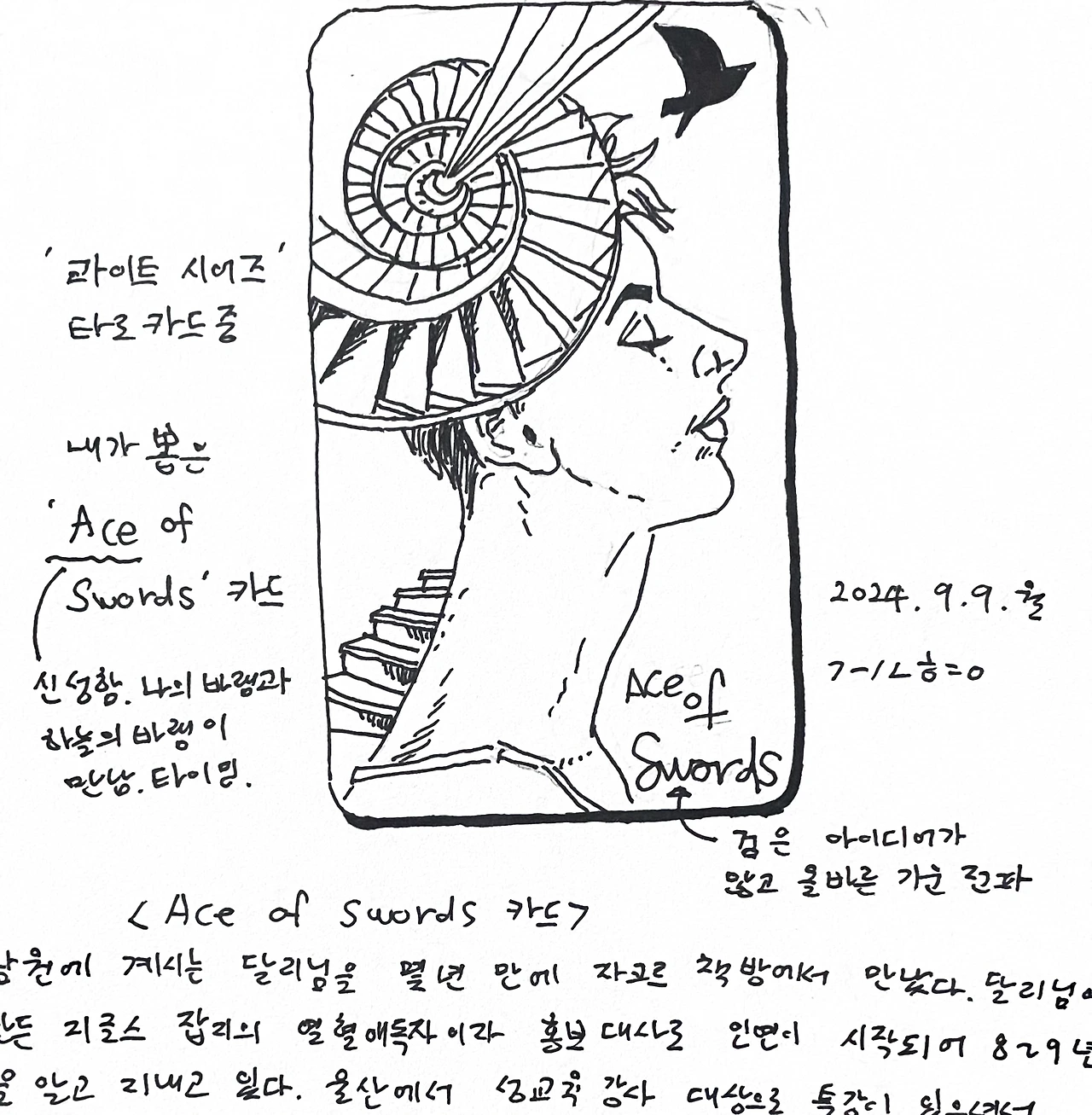 남원에 계시는 달리님을 몇년 만에 자크르 책방에서 만났다. 달리님이 만든 지글스 잡지의 열혈 애독자이자 홍보대사로 인연이 시작되어 8~9년을 알고 지내고 있다. 울산에서 성교육 강사 대상으로 특강이 있으셔서, 내게 그날 혹시 시간이 있냐고 먼저 물으셨고, 자크르에서 글쓰기 수업까지 해 주기로 하셨다. 글쓰기 수업을 시작하며 자신이 하고 싶은 말을 알아야 혹은 있어야 글을 쓸 수 있다고 말씀하셨다. 자기에 대한 탐구와 그 욕구가 있어야 글을 쓸 수 있는 것이다. 자기 탐구에 대한 욕구가 없거나 그 탐구를 두려워 하는 사람들은 글을 쓰기 어려울 수 밖에. 시 두편을 읽으며 편하게 모임을 열어 주셨다. 자기 탐구에 대한 질문들을 읽고 짧은 시간동안 적게 하셨고, 쓰기 힘든 질문과 쓰고 싶은 이야기가 많은 질문을 고르라 하셨다. 그리고 두 질문 중 하나를 생각하고 타로 카드 한장을 뽑으라 하셨다. 내가 고른건 Ace of swords 카드. ’항상 감사하게 여기는 일은?‘ 이라는 질문에 길게 글을 쓰고 싶었고, 짝지와 만나 같이 산일이라고 썼다. 짝지는 내 은인이니깐. 몇년 만에 달리님을 만나 기뻤다. 달리님은 나의 좋은 그리고 멋진 페미니스트 동료이다.