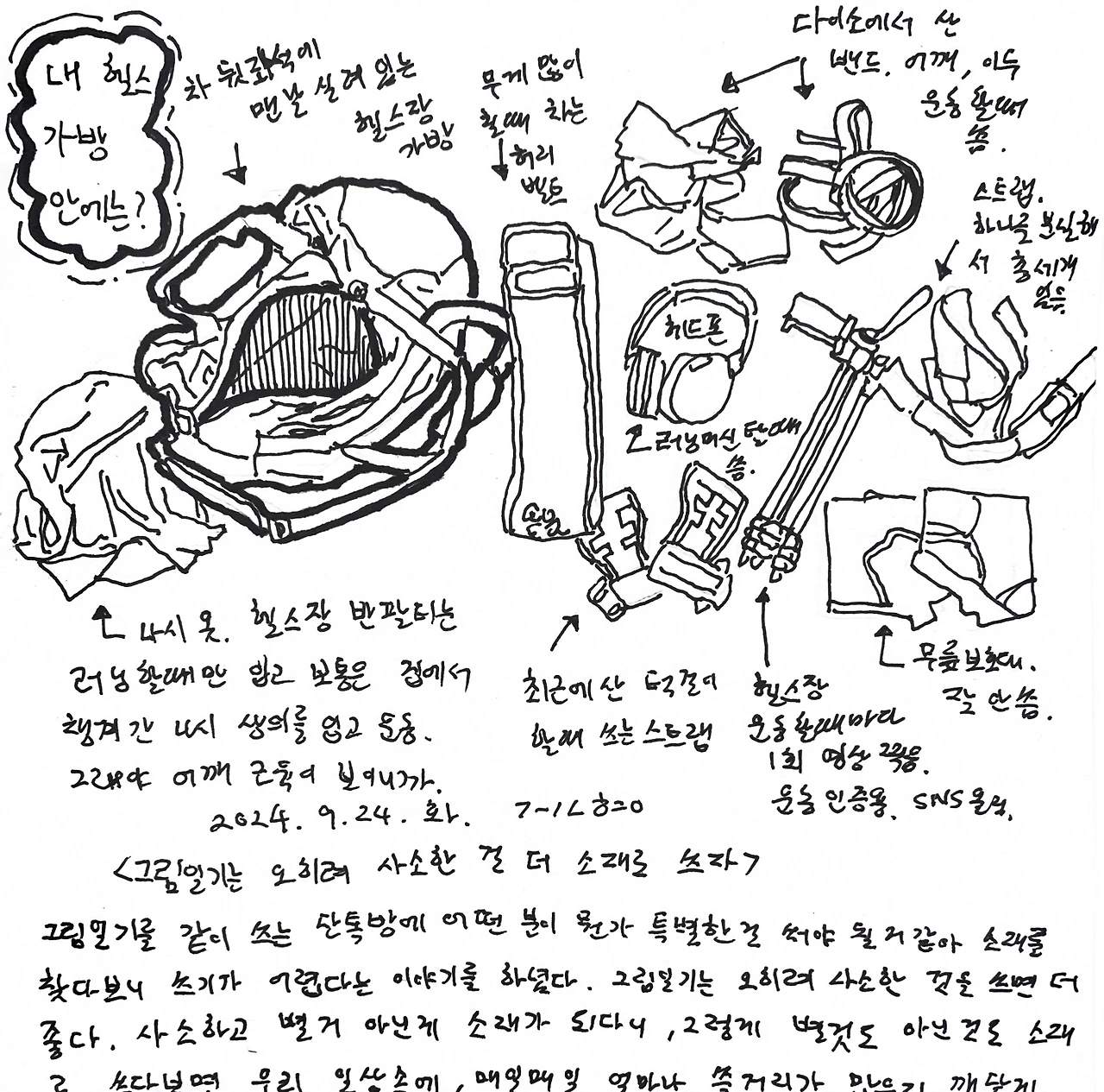 그림일기를 같이 쓰는 단톡방에 어떤분이 뭔가 특별한 걸 써야 될거 같아 소재를 찾다보니 쓰기가 어렵다는 이야기를 하셨다. 그림일기는 오히려 사소한 것을 쓰면 더 좋다. 사소하고 별거 아닌게 소재가 되다니, 그렇게 별것도 아닌것도 소재로 쓰다보면 우리 일상속에, 매일매일 얼마나 쓸거리가 많은지 깨닫게 된다. 글쓰기도 마찬가지다. 글도 많이 안써본 사람이 뭔가 대단한걸 쓰고자 하니 글이 안써지는 법. 사소한 것이라도 소재로 삼아 죽이되든 밥이되든 자꾸 써 버릇해야 그중에서 꽤 괜찮은 글이 나오는 법이다. 헬스장에서 나오는 길에 이 단톡방 글을 보고, 바로 헬스장 가방안에 있는 것들을 쭉 깔아 놓고 사진을 찍었고 그걸로 그림일기를 쓴다. 내 가방 안의 물건들, 오늘의 내 패션, 내가 좋아하는 티비프로, 최근에 본 영화, 오늘 장 본 것, 내 베프 소개, 반려견이나 반려묘 소개, 내 책상위 모습, 직장에서의 내 책상위, 부엌의 풍경 등등 모든 것이 그림일기의 소재다.