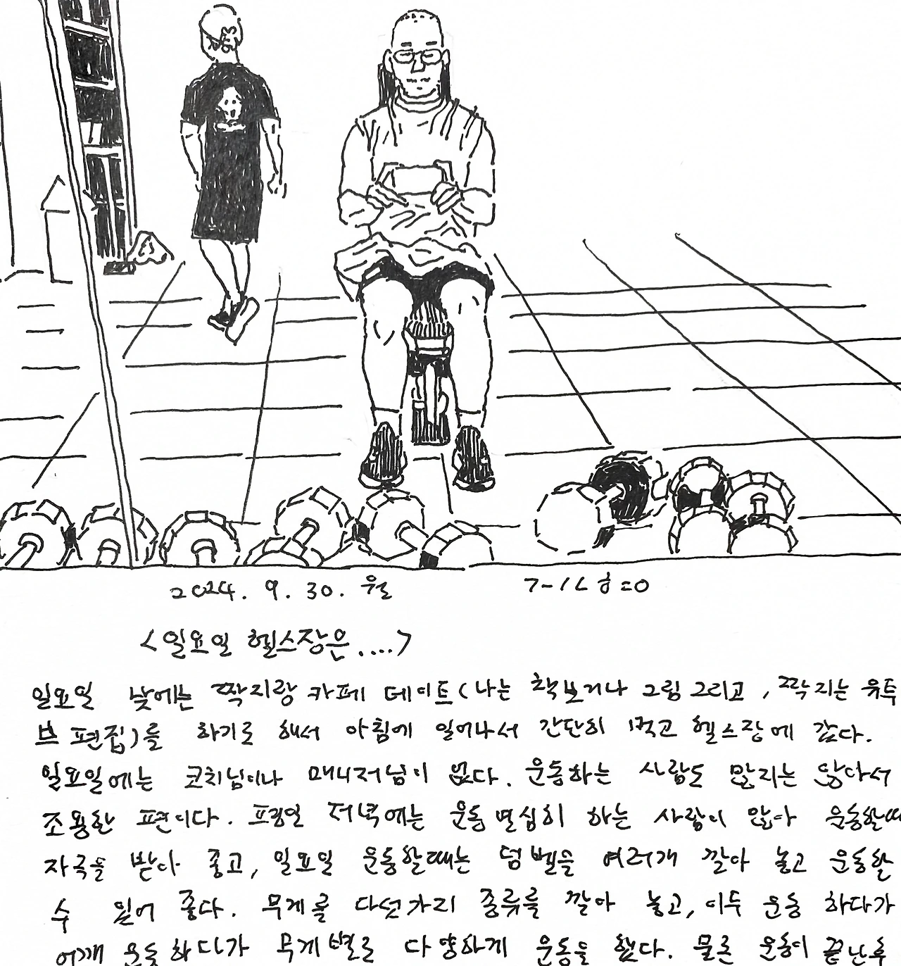 일요일 낮에는 짝지랑 카페 데이트(나는 책보거나 그림 그리고, 짝지는 유투브 편집)를 하기로 해서 아침에 일어나서 간단히 먹고 헬스장에 갔다. 일요일에는 코치님이나 매니저님이 없다. 운동하는 사람도 많지는 않아서 조용한 편이다. 평일 저녁에는 운동열심히 하는 사람이 많아 운동할때 자극을 받아 좋고, 일요일 운동할때는 덤벨을 여러개 깔아 놓고 운동할 수 있어 좋다. 무게를 다섯가지 종류를 깔아 놓고, 이두 운동 하다가 어깨 운동하다가 무게별로 다양하게 운동을 했다. 물론 운동이 끝난후에는 다시 원래자리로. 기구 운동할때도 평일에는 잠시만 자리를 비우면 다른 사람이 하거나 이거 해도 되는지 물어보기 때문에 그 기구 앞을 지켜야 한다. 1시간 정도 운동을 하고 있을때 서로 인사하는 코치님이 오셨다. 간호사 일도 하고 선수로도 뛰고 PT수업도 하시는 코치님. 수업 하나 때문에 나오셨는데, 수업 끝난뒤 자기 운동도 하고 가신다고 했다.