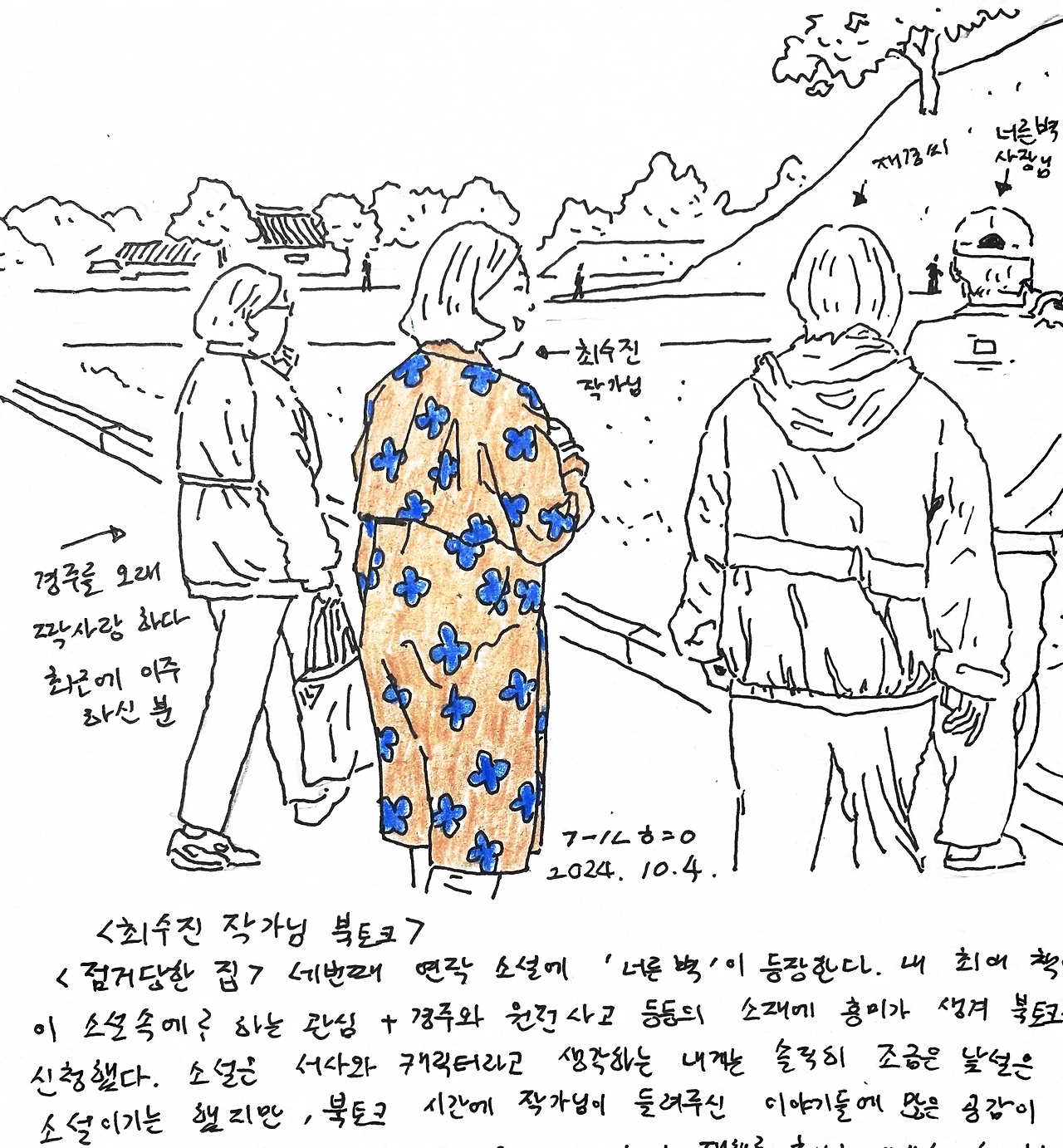 <점거당한 집> 세번째 연작 소설에 ‘너른벽’이 등장한다. 내 최애 책방이 소설속에? 하는 관심 + 경주와 원전사고 등등의 소재에 흥미가 생겨 북토크를 신청했다. 소설은 서사와 캐릭터라고 생각하는 내게는 솔직히 조금은 낯설은 소설이기는 했지만, 북토크 시간에 작가님이 들려주신 이야기들에 많은 공감이 갔다. 원전이 많은 경상도권은 원전의 피해와 재해를 충분히 상상할 수 있는 위치이고, 재해적인 사건들이 연이어 일어나고 있는 한국사회이다보니 지역에서 그 재해들 속에서 살아간다는 것에 대해 고민하고 이야기를 던지는 소설이었다. 주말과 수요일에는 일을 하시고 나머지 시간에는 소설을 쓰신다는 작가님의 삶을 상상해 본다. 문학상을 받긴 했지만, 특별한 보상이 주어지지 않는 글을 쓰는 삶이란 쉽지 않은 삶이다. 자기를 믿고 묵묵히 몸으로 밀어내며 글을 쓰는 삶이다. 네번째 연작 소설이 완성되면 또 투고를 해보신다고 했다. 북토크가 끝나고 사인을 해주실때 독자들에게 원하는 그림을 묻고 사인 옆에 그림을 그려주셨다. 그 마음이 참 감사했다. 사인이 끝난후 우리는 너른 벽 앞에서 기념촬영을 하고 근처 큰 나무가 자라는 무덤 앞으로 산책을 갔다. 언제나 봐도 경이롭고 신비로운 무덤이다.